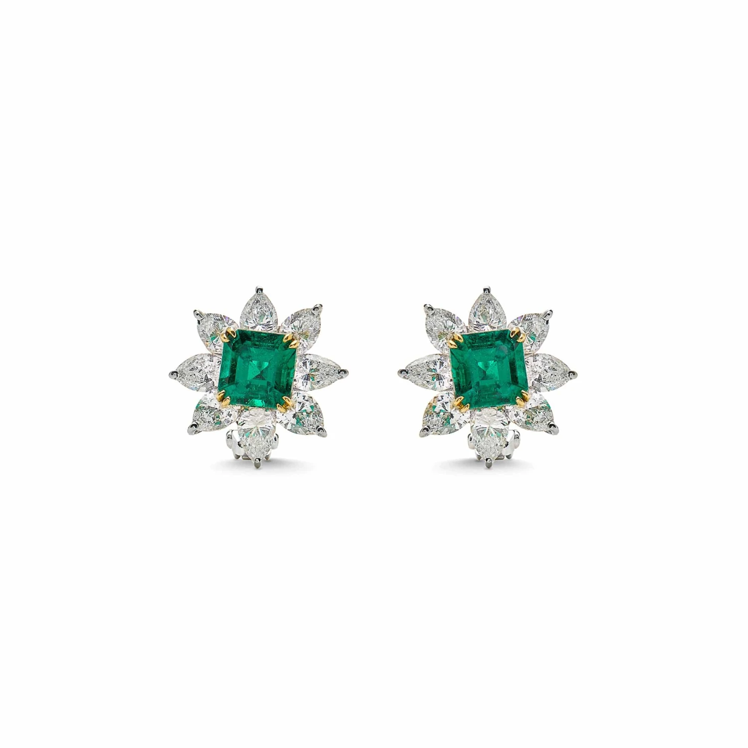 Some fine jewels are unforgettable. Such is this case with these one-of-a-kind Bayco Emerald and Diamond Stud Earrings. Nearly 6 carats of F- and G-color pear-shaped diamonds form a brilliant halo around exquisite Colombian emeralds weighing a combined 4 carats. The Asscher-cut emeralds possess the glow of the finest quality emerald material, instantly lighting up the wearer’s face in the way only Colombian emeralds can.
