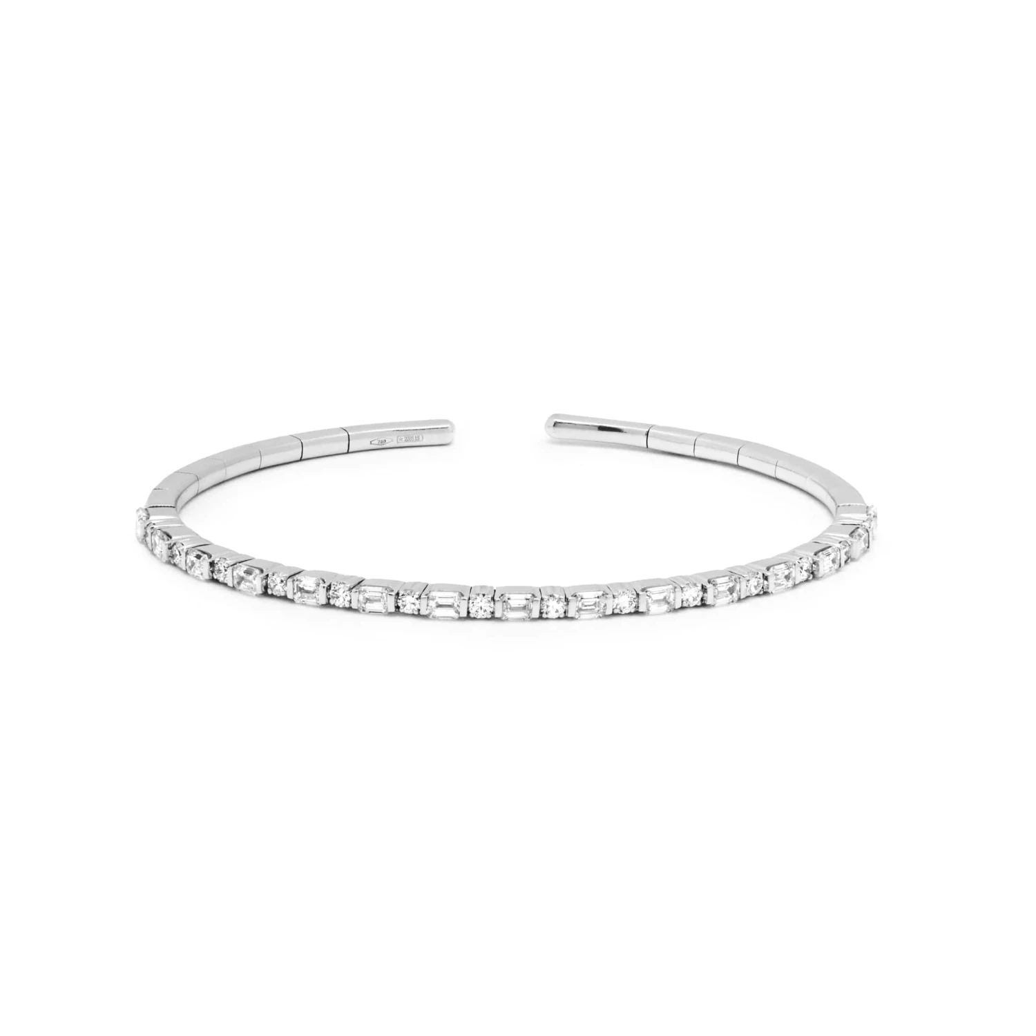 Alternating round brilliant-cut diamonds and baguette-shaped diamonds add interest to a classic fine jewelry silhouette. The Mixed Diamond Flexible Cuff Bracelet boasts nearly 2 carats of sparkling diamonds set in chic 18-karat white gold. The bangle’s flexible construction makes it comfortable to wear and easy to slip on and off.