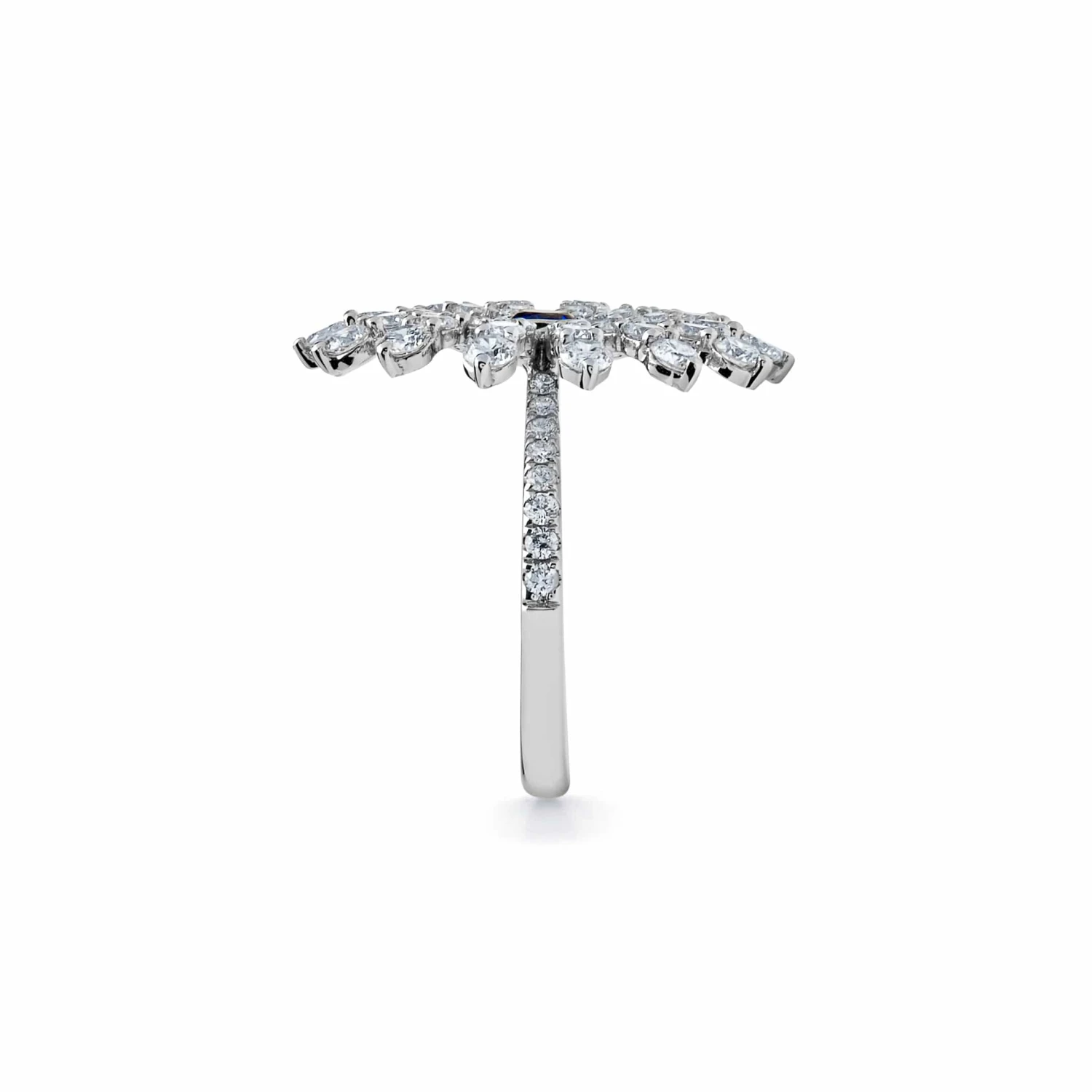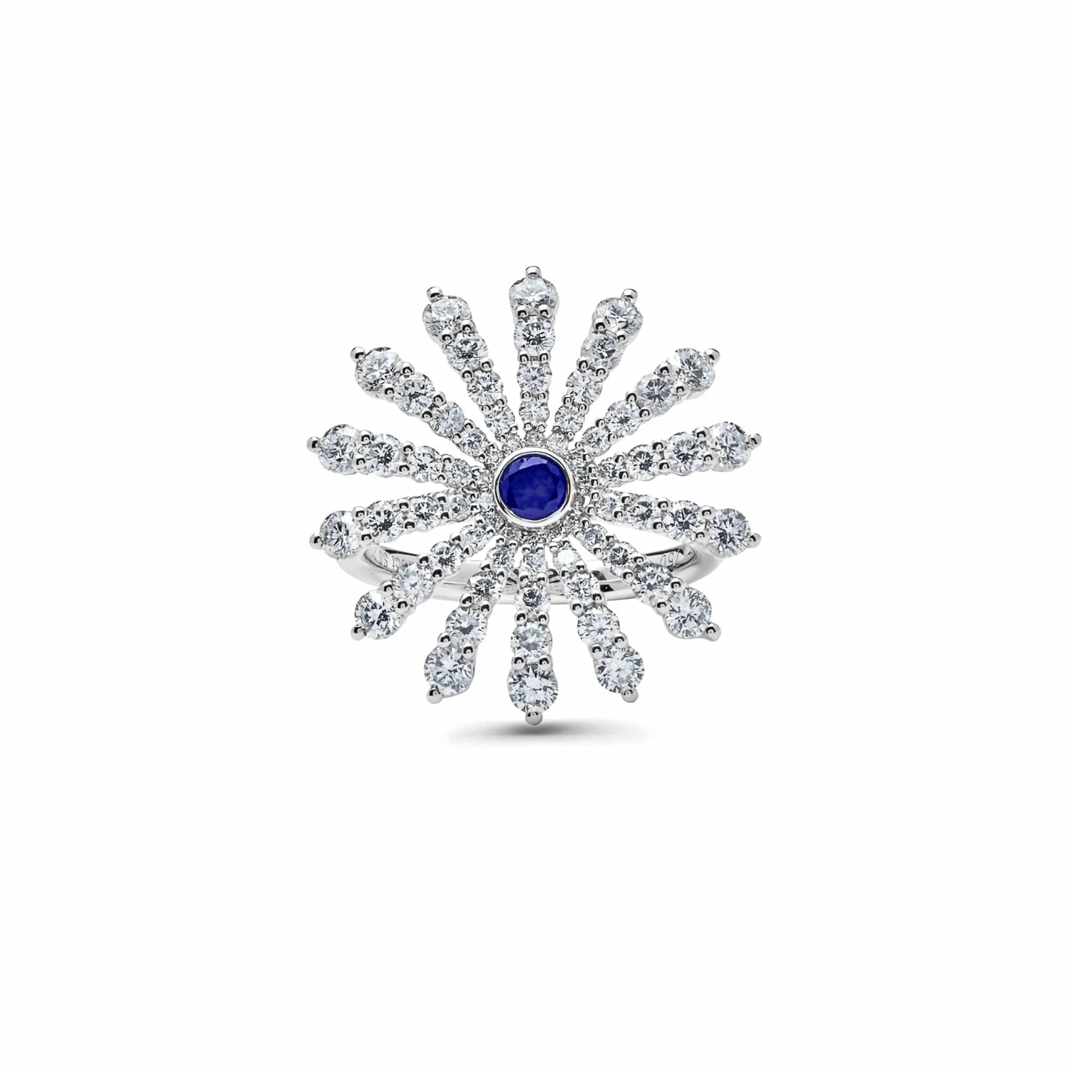 White Gold Flower Ring with White Diamonds and Blue Sapphires