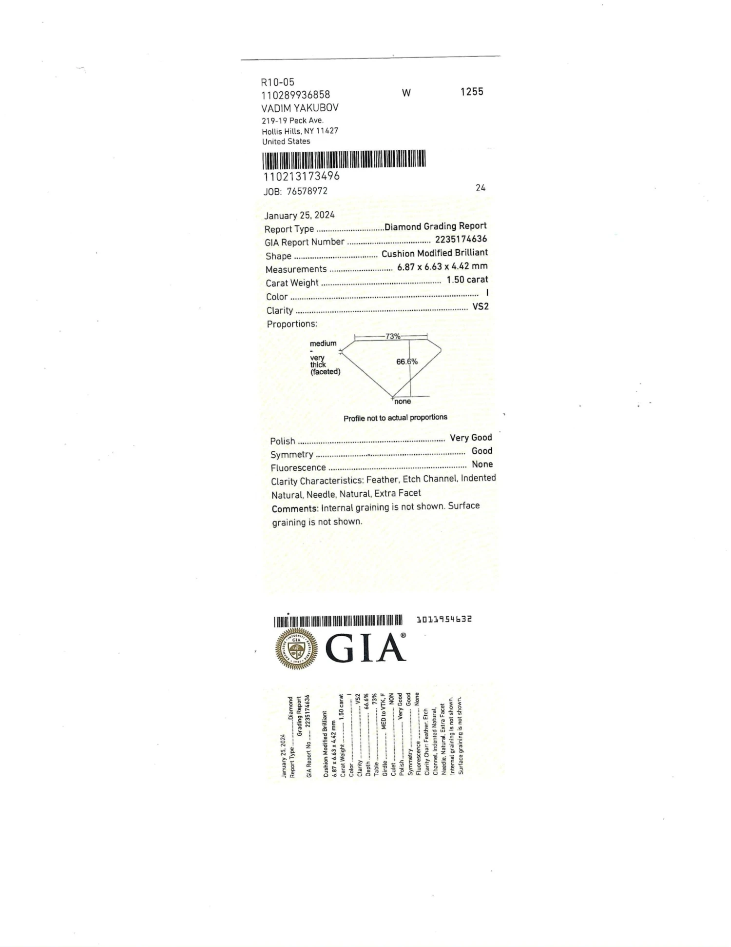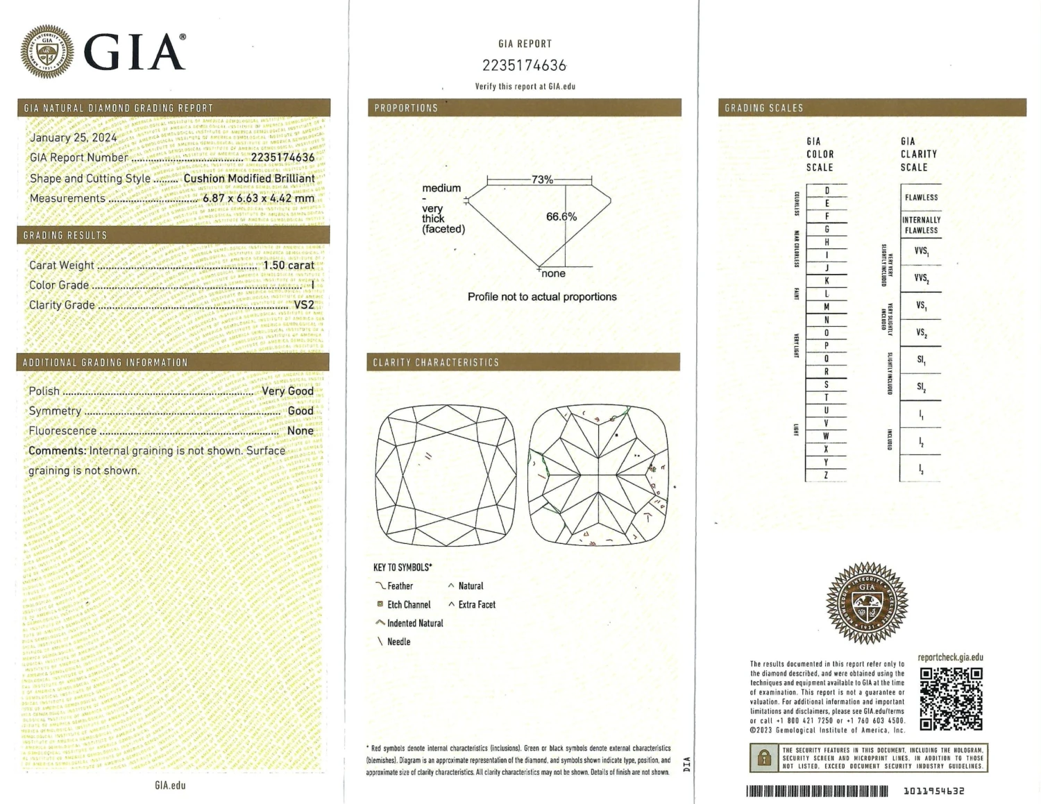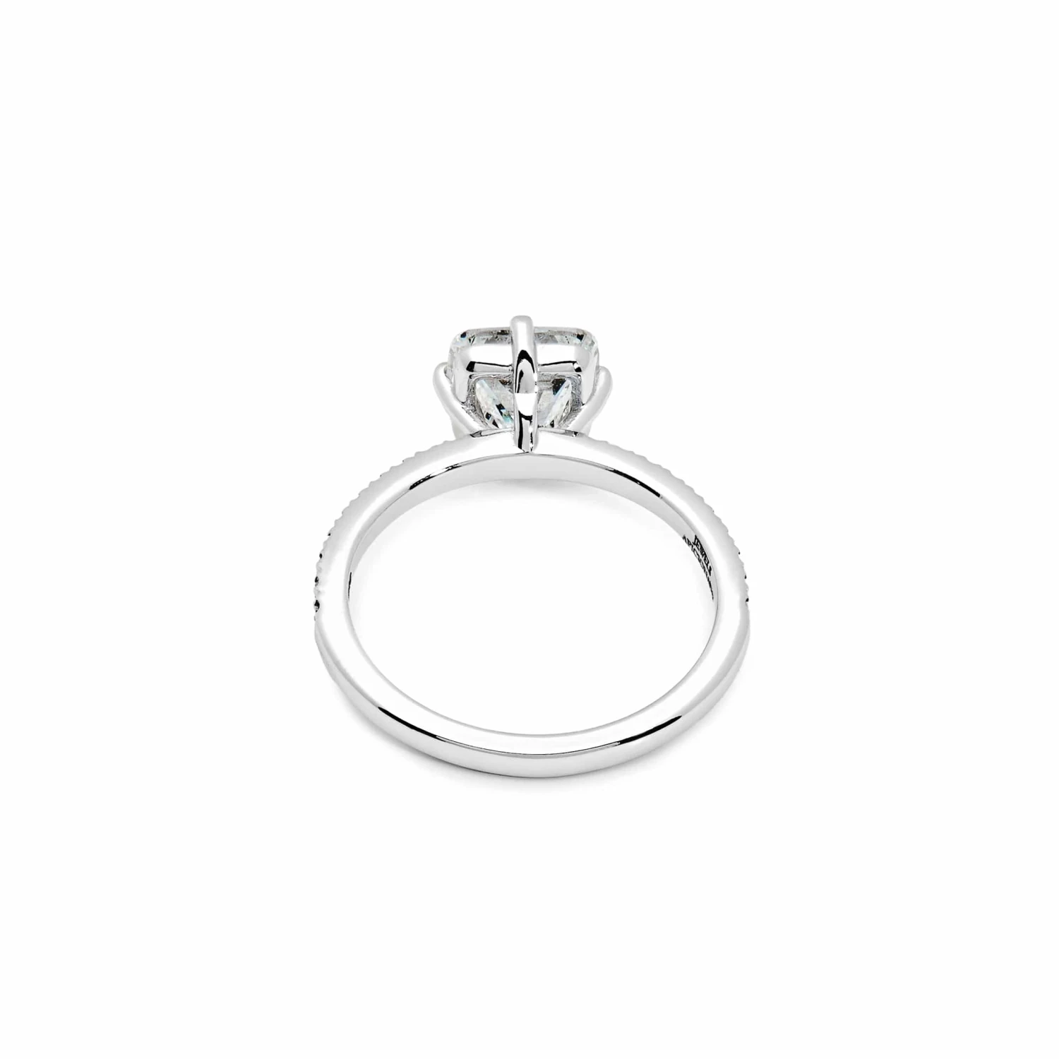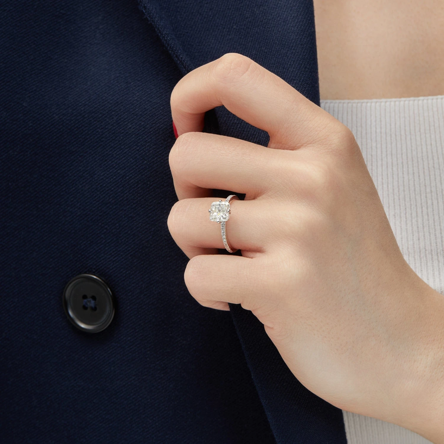 Cushion cut diamond ring settled on a white gold band with small diamonds on the shank.
