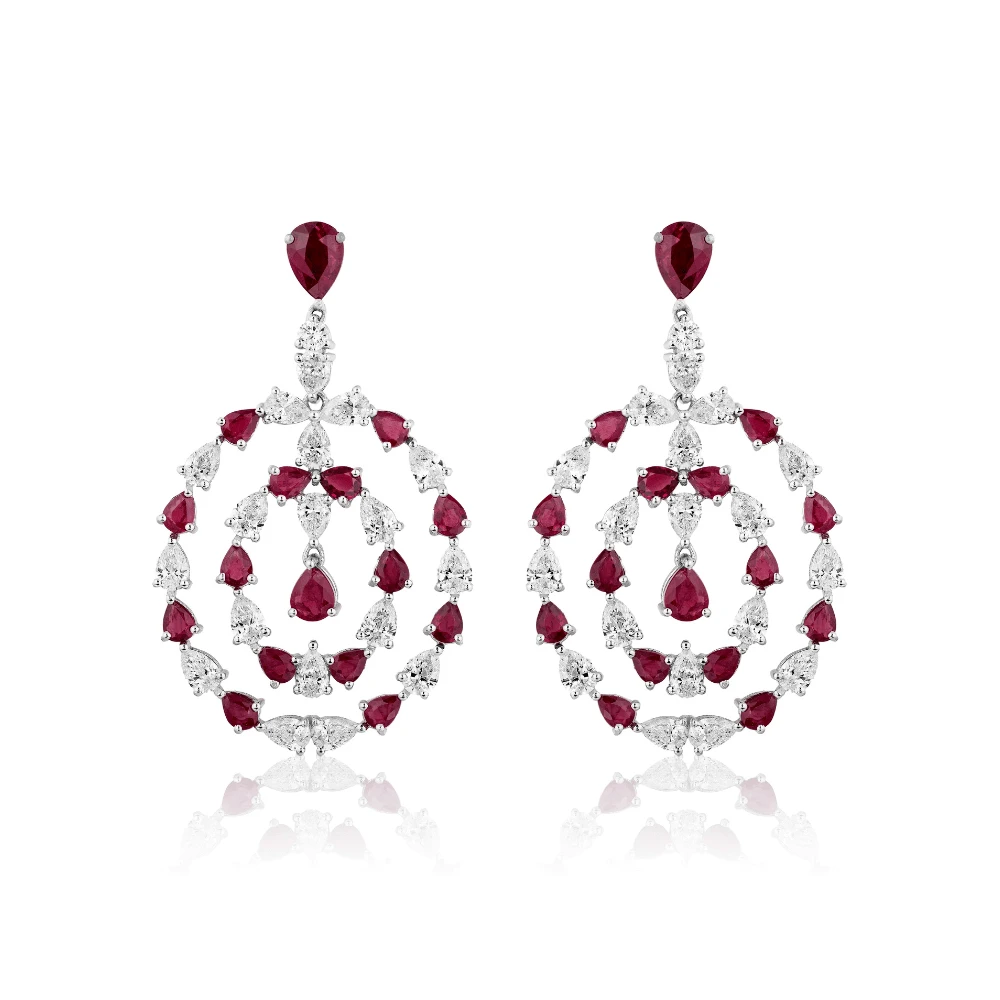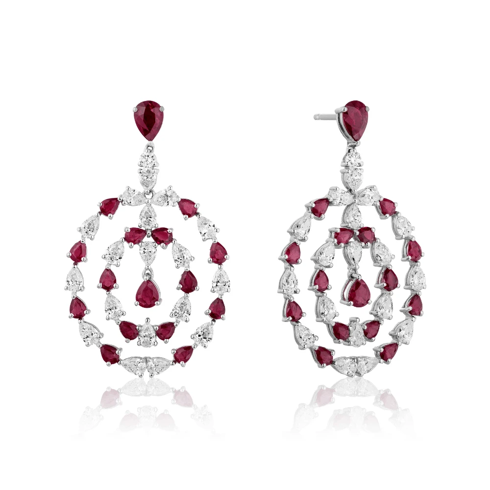 These exquisite earrings feature dangling pear cut diamonds and rubies set in 18k white gold. The romantic circular silhouette compliments a lavish attire. Pair yours with an elegant gown or formal ensemble to complete the look.