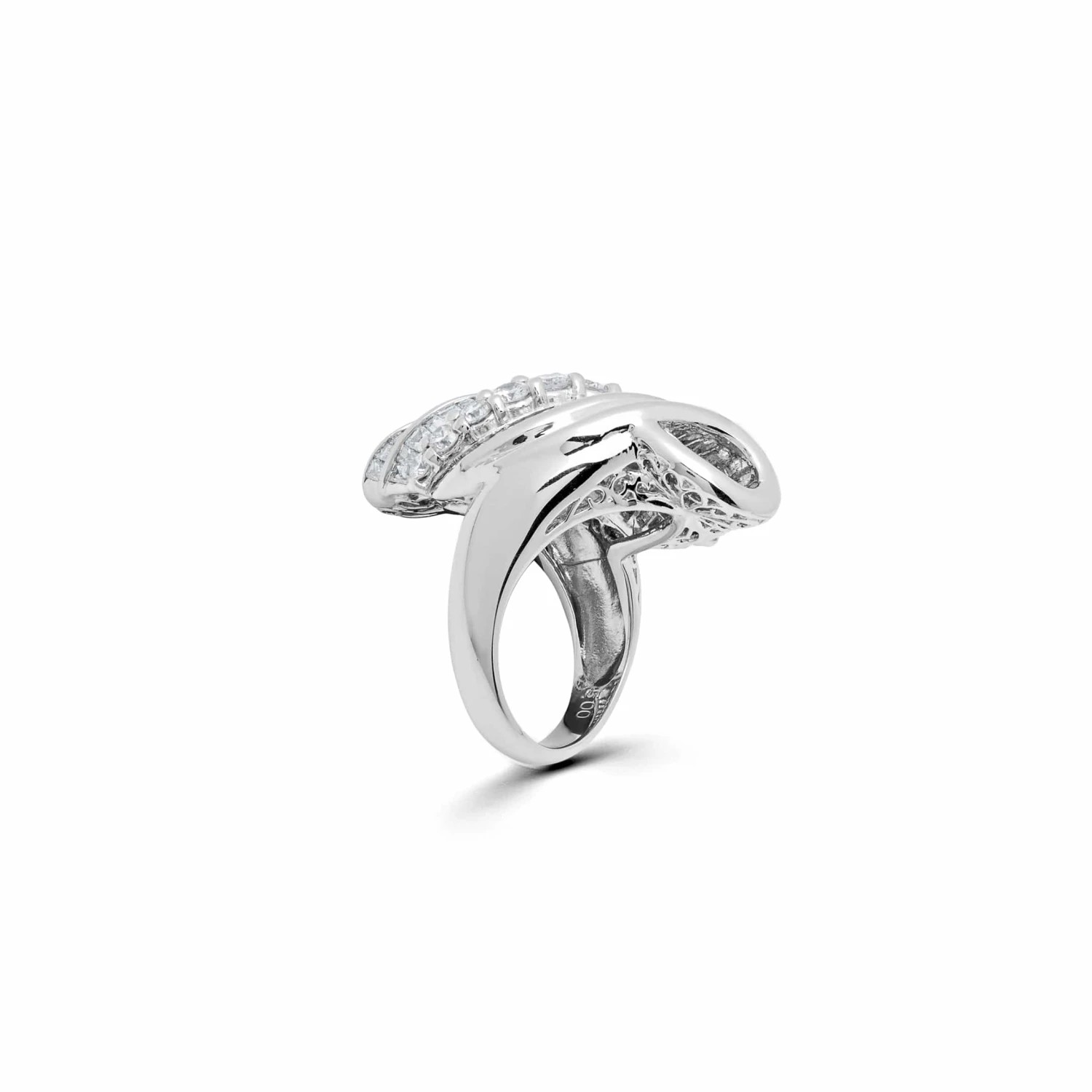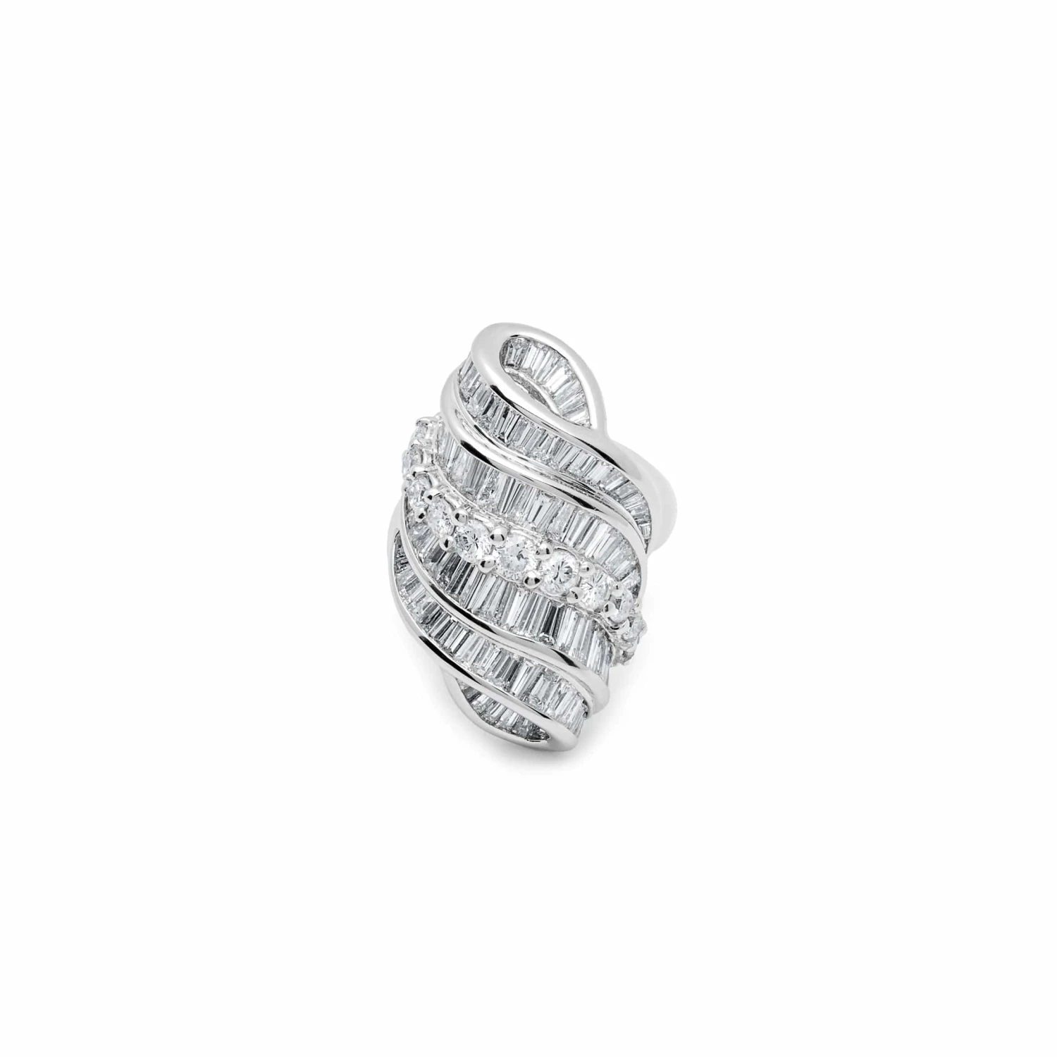 From the Jewels Aficionado Estate Jewelry collection comes an abstract rendition of a curving seashell. The Diamond Seashell Ring features five rows of undulating diamonds–a mix of tapered baguette-cut stones and round brilliant-cut stones–all set in platinum. This bold cocktail style ring features five carats of bling.