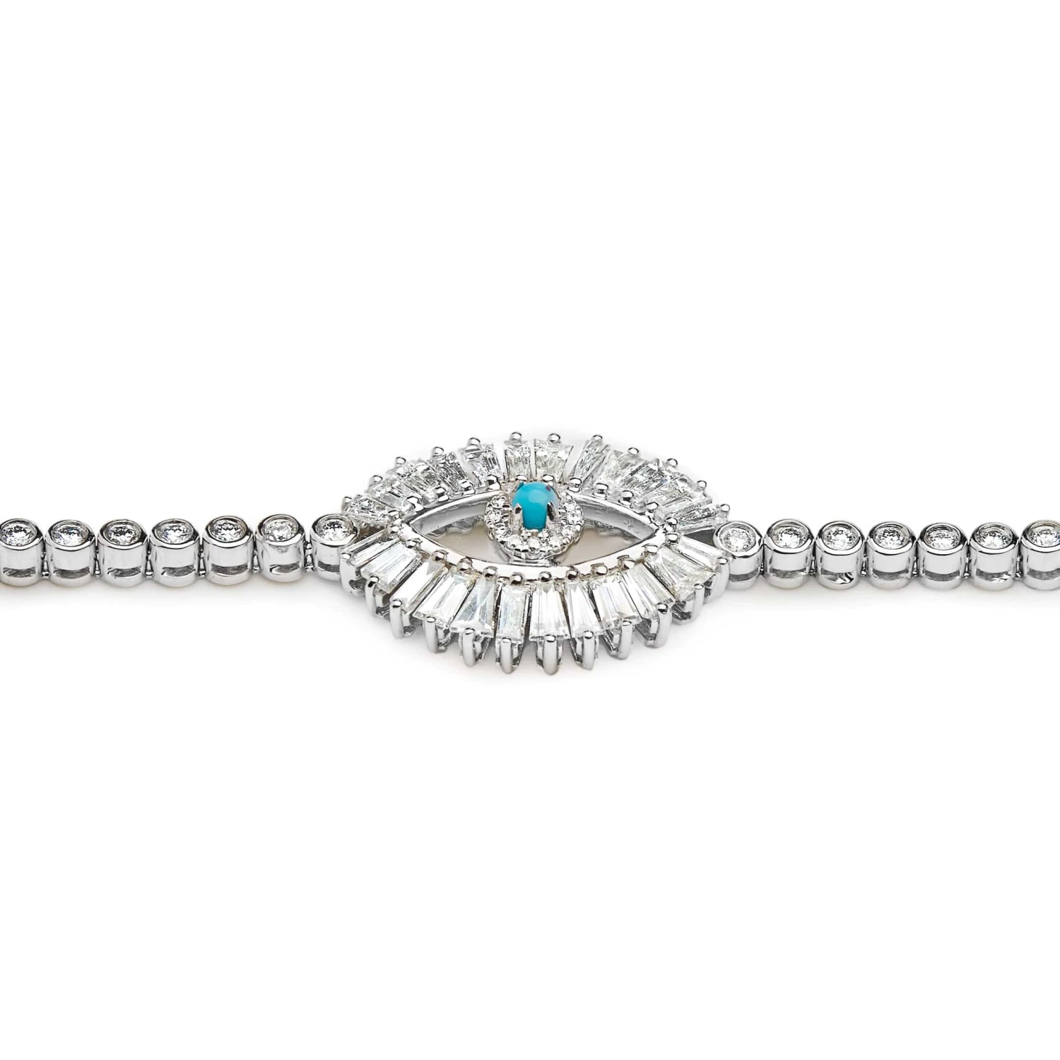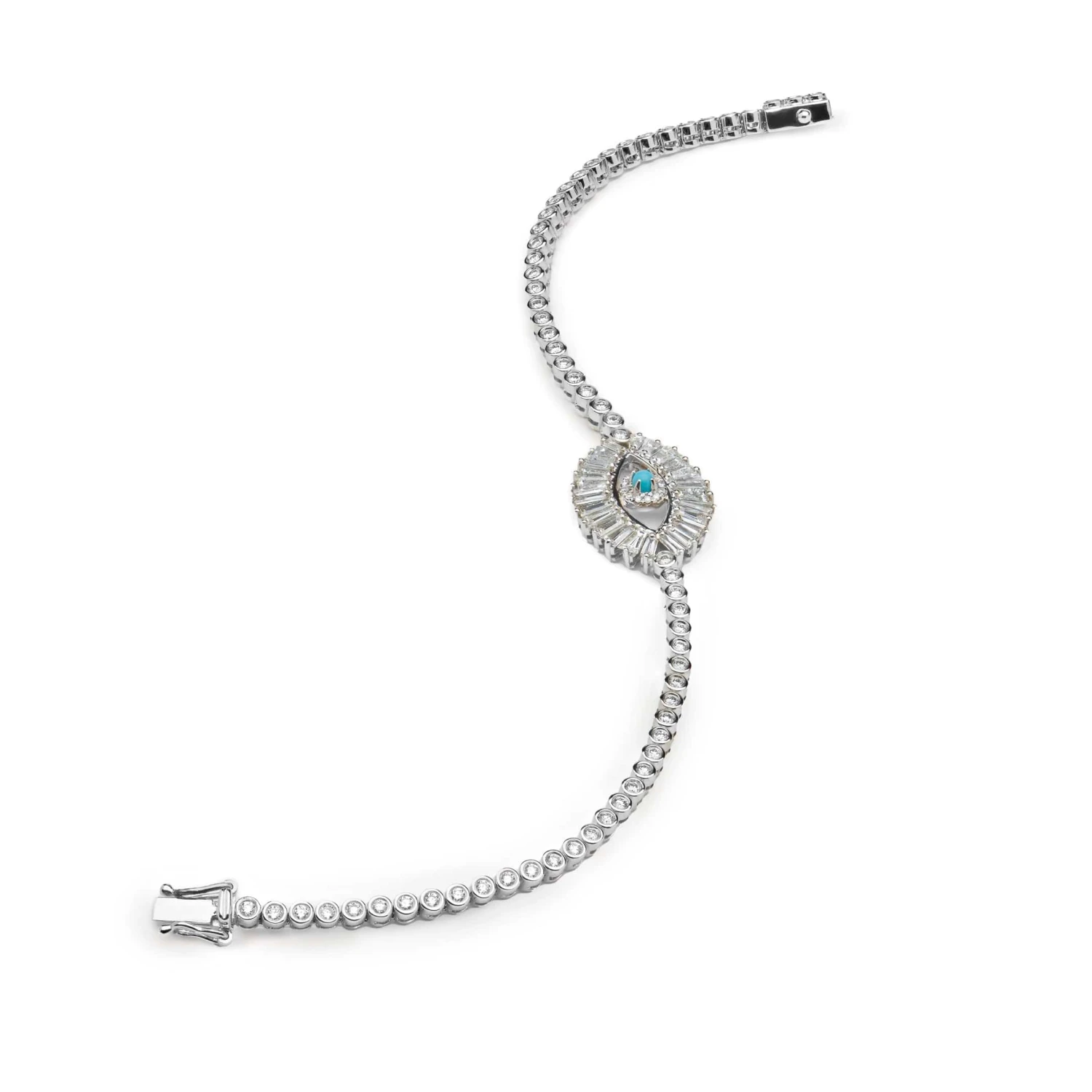 White Gold Evil Eye Bracelet with Baguette and Round Diamonds Centered with a Single Turquoise Cabochon