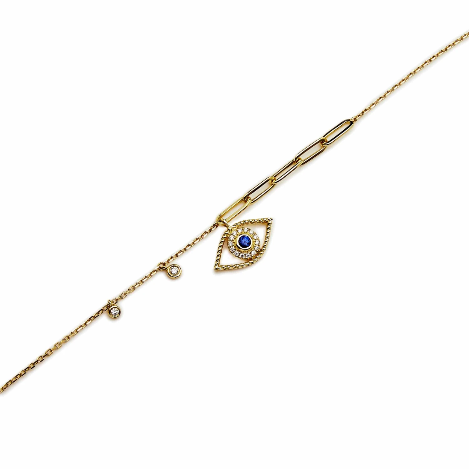 Yellow Gold Evil Eye Chain Bracelet with Blue Sapphire in a White Diamond Halo and Two Accent Diamonds