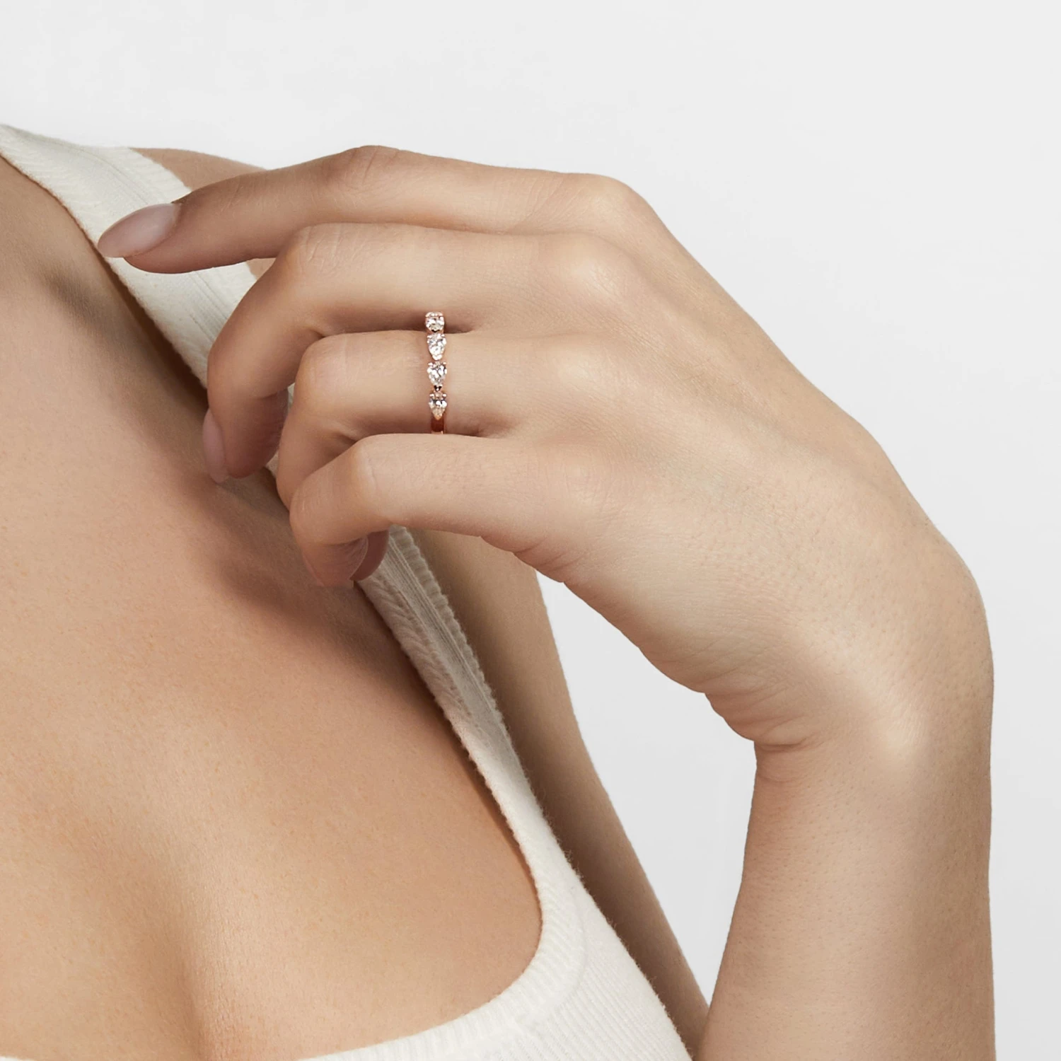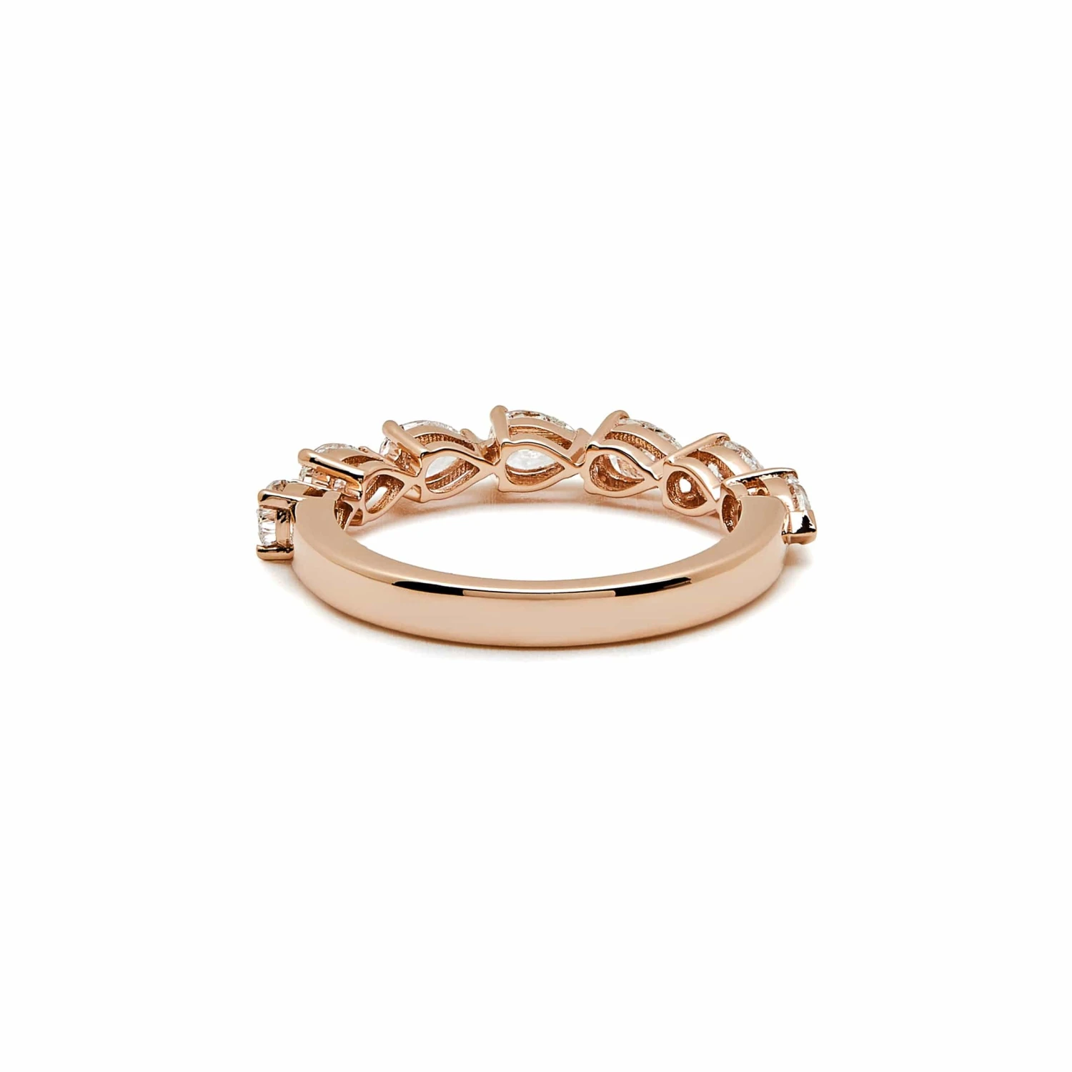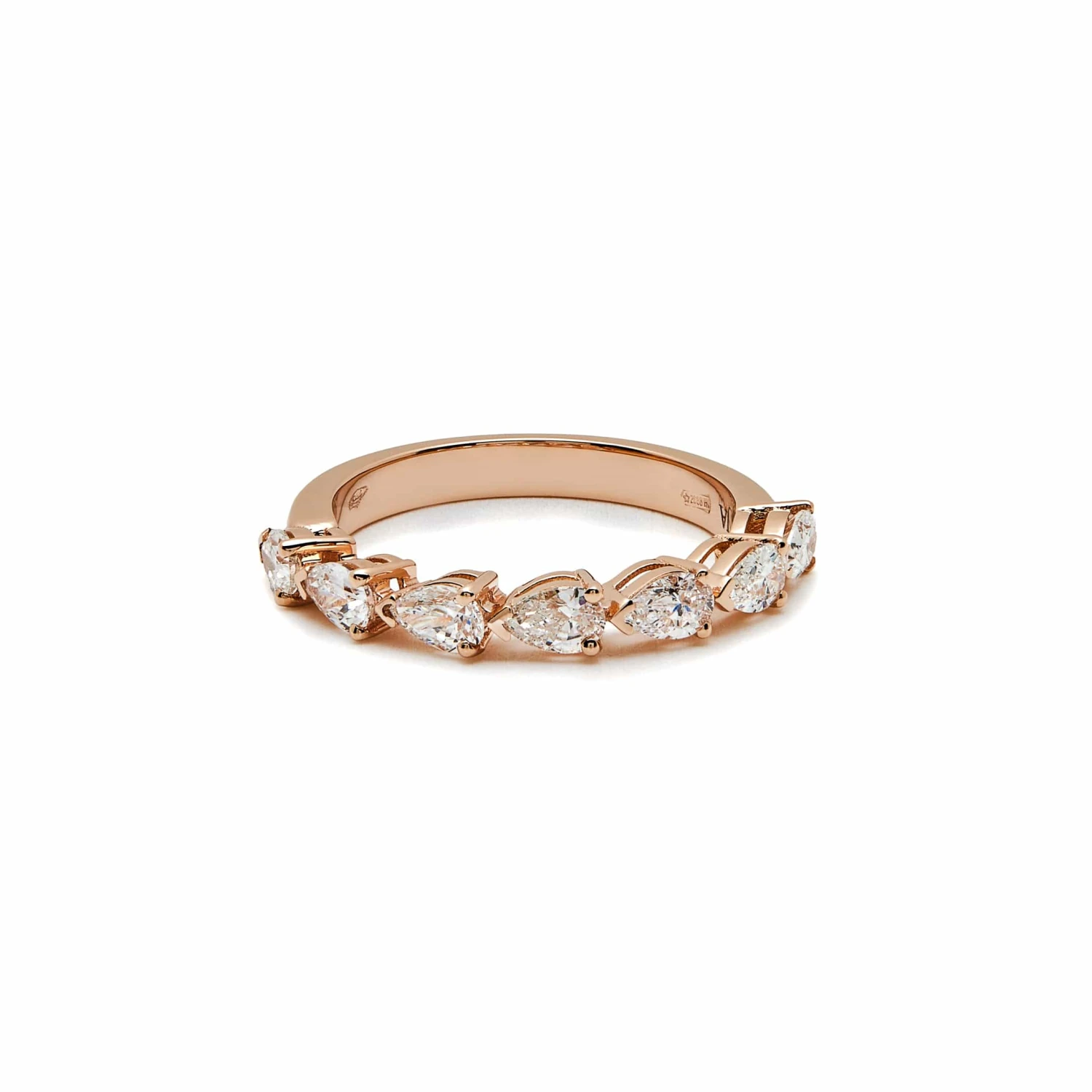 Evoke elegance and sophistication in the Jewels Aficionado Pear-Shaped Diamond Half Eternity Band. A row of breathtaking pear-shaped diamonds set horizontally guides the eye from left to right, each pointed diamond edge like the tip of an arrow. The stunning 18-karat rose gold and diamond band makes a bold style statement on its own, but can also be stacked with other rings.