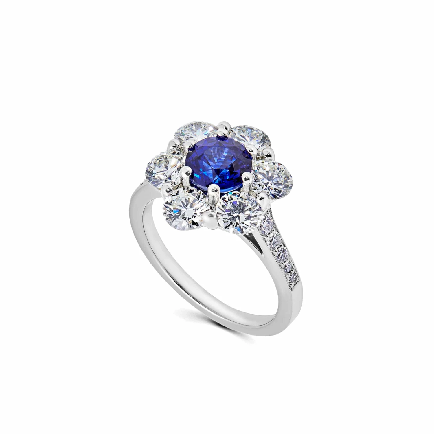 Platinum Diamond and Sapphire Halo Pave-Accented Ring