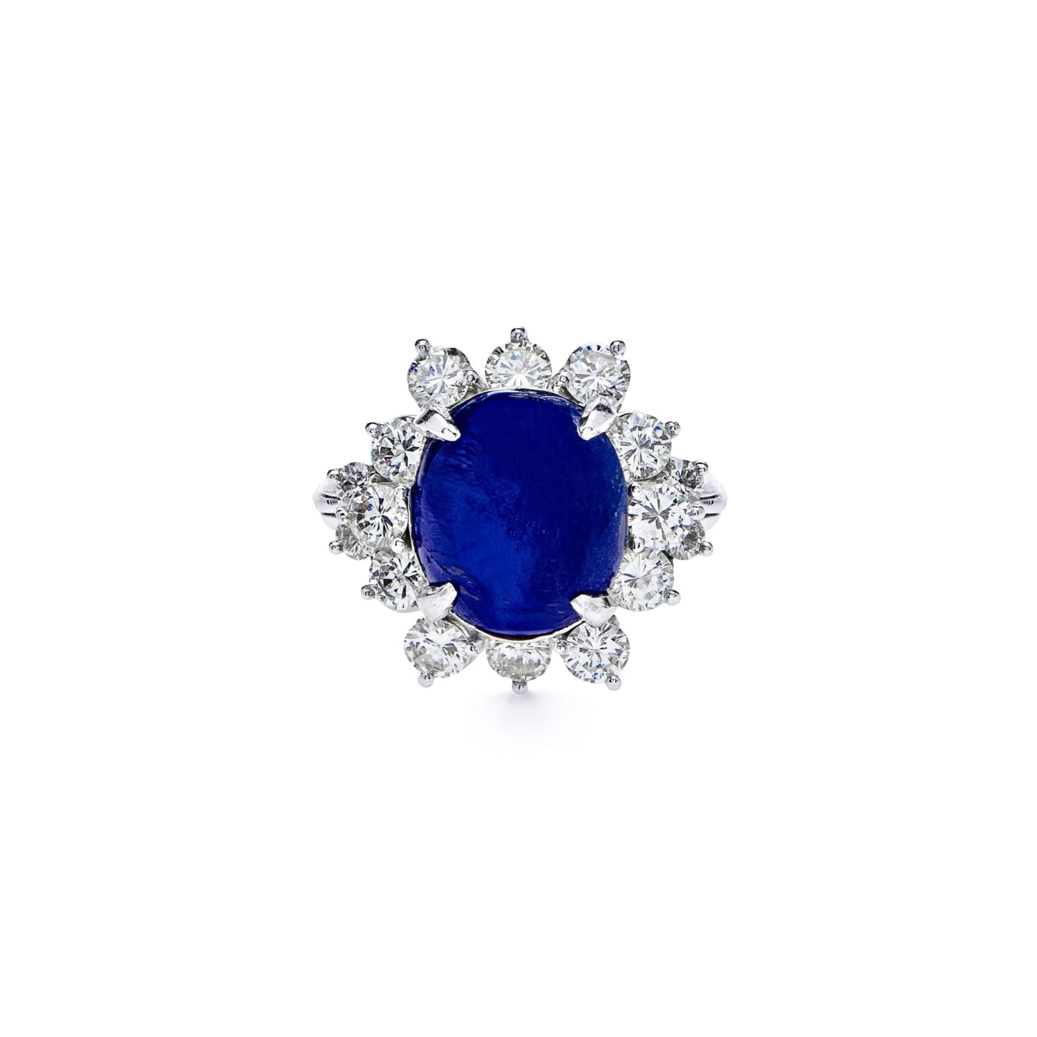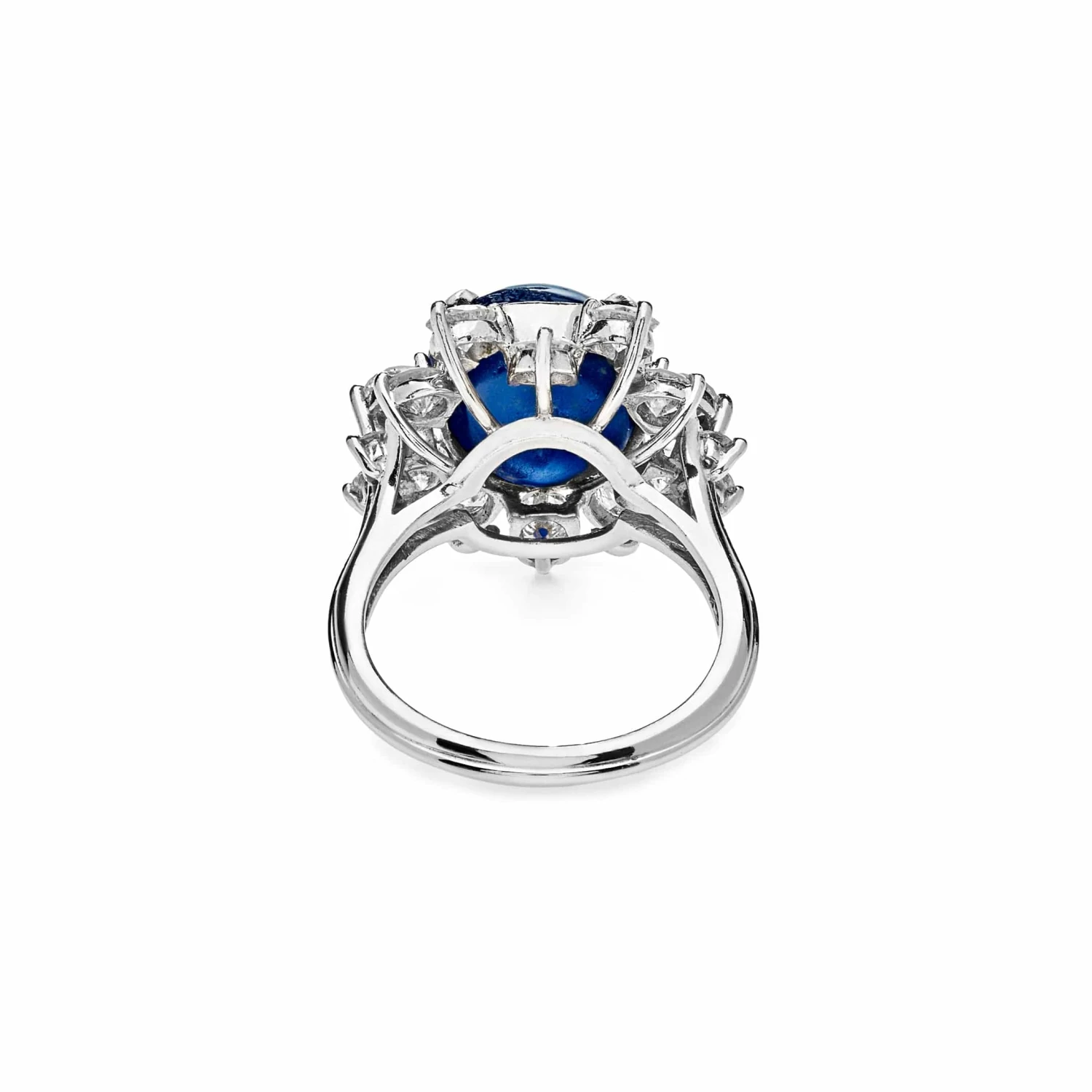 Cabochon Cut Oval Blue Sapphire and Diamond Star Ring, Partially Polished