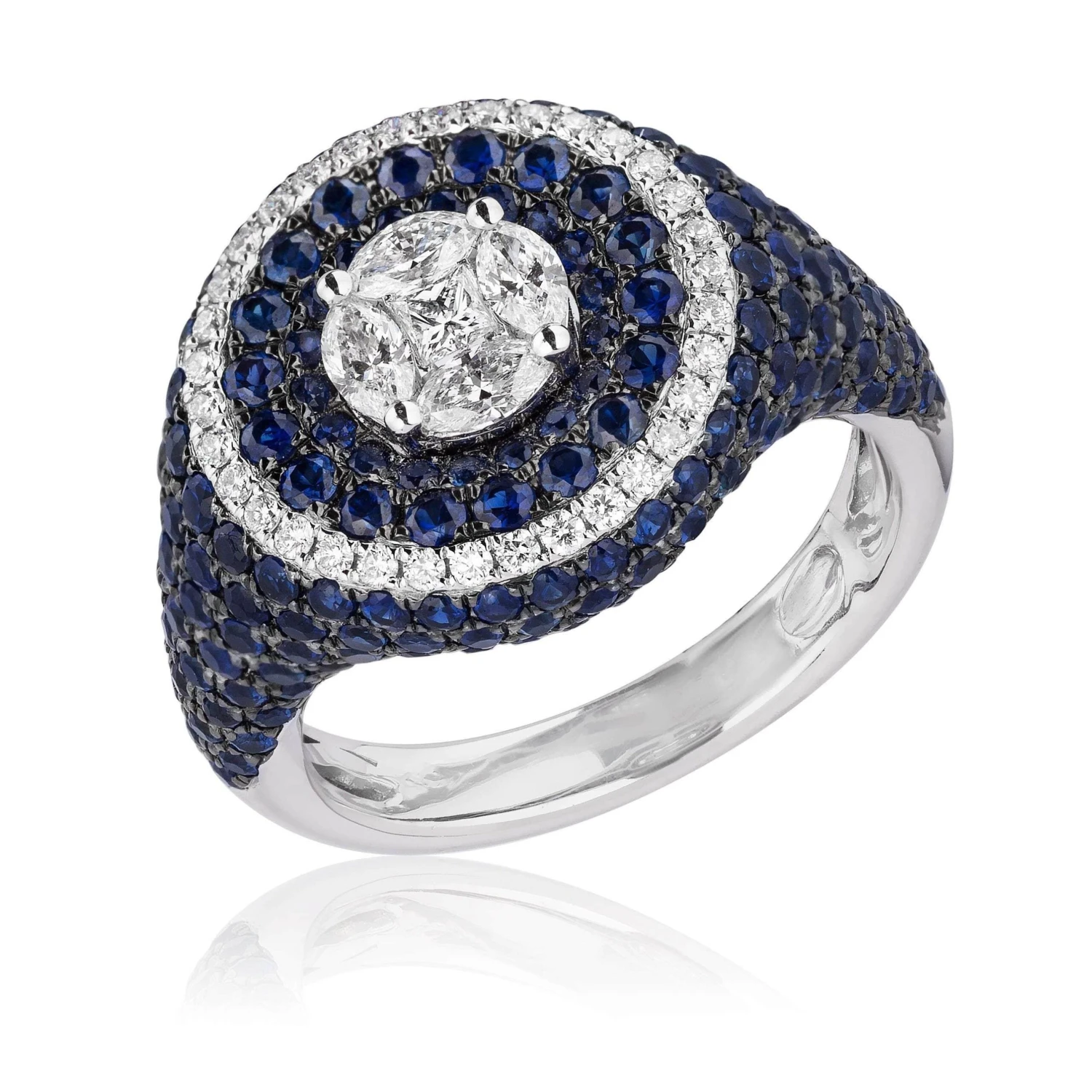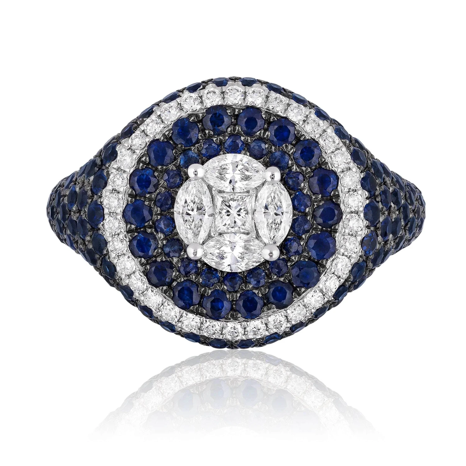 This glamorous ring features a circular silhouette punctuated by diamonds and sapphires. Wear yours with diamond earrings to complete the look.