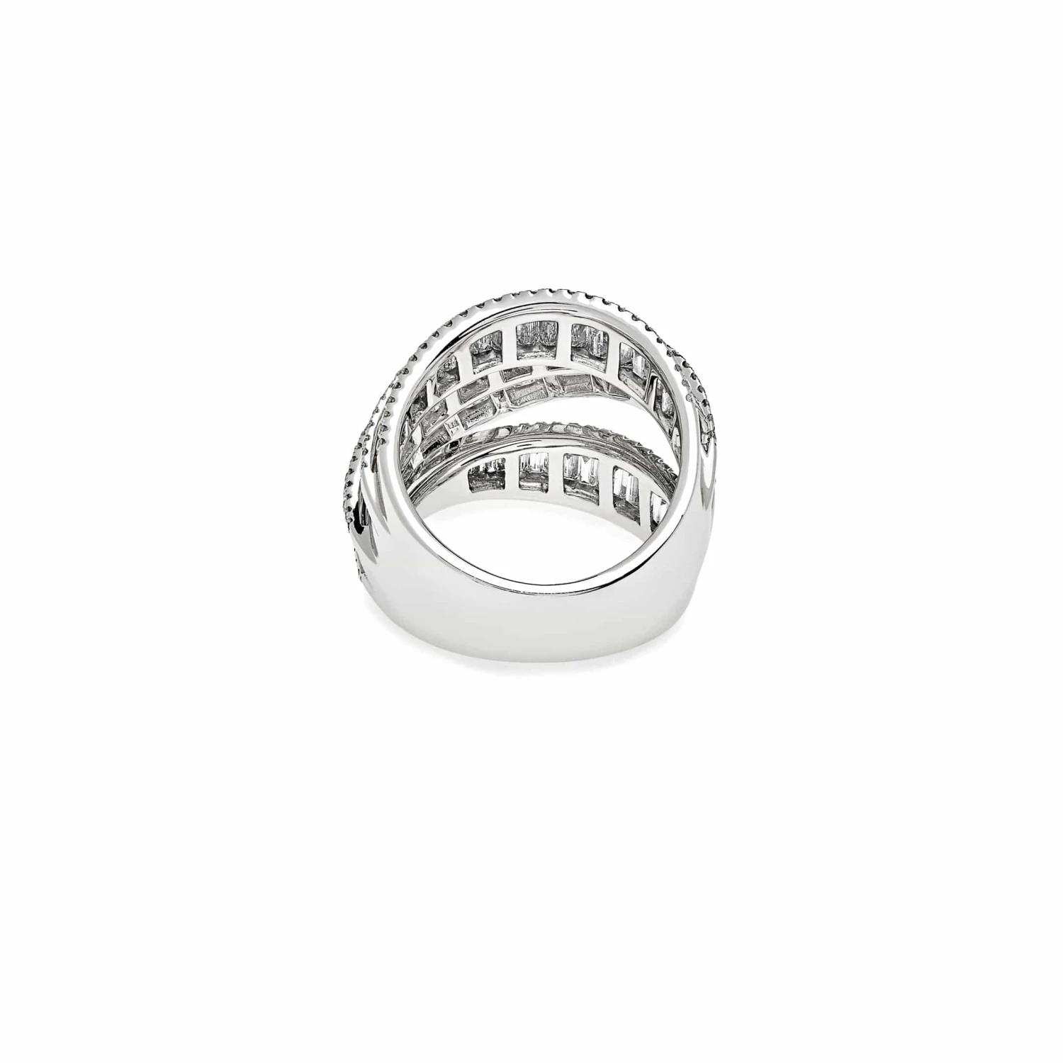 Crafted in 18K white gold, this stunning style features row after layered row of shimmering round and channel-set baguette-cut diamonds in a criss-crossing layered pattern.