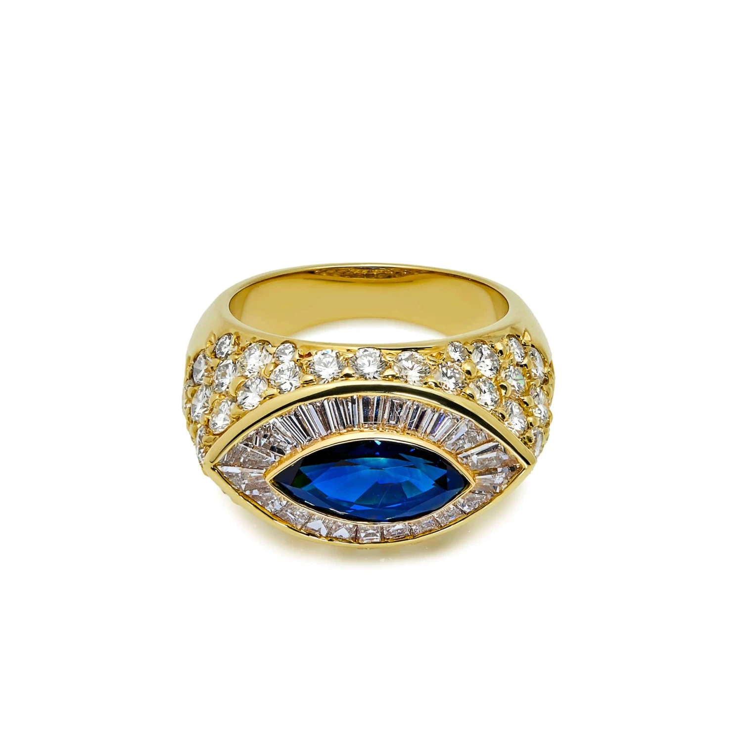 Yellow Gold Marquise Blue Sapphire and Baguette Round Diamond Ring