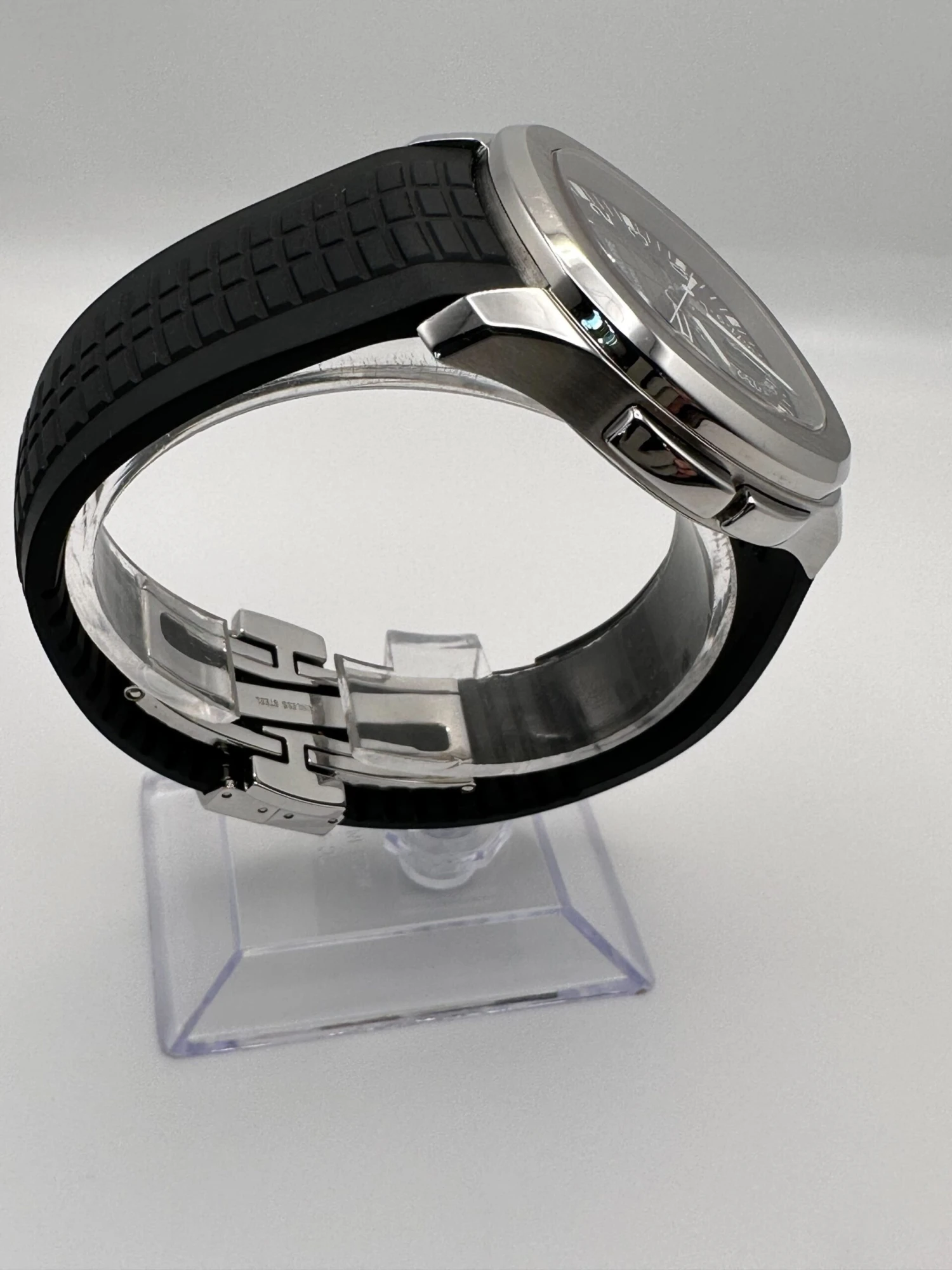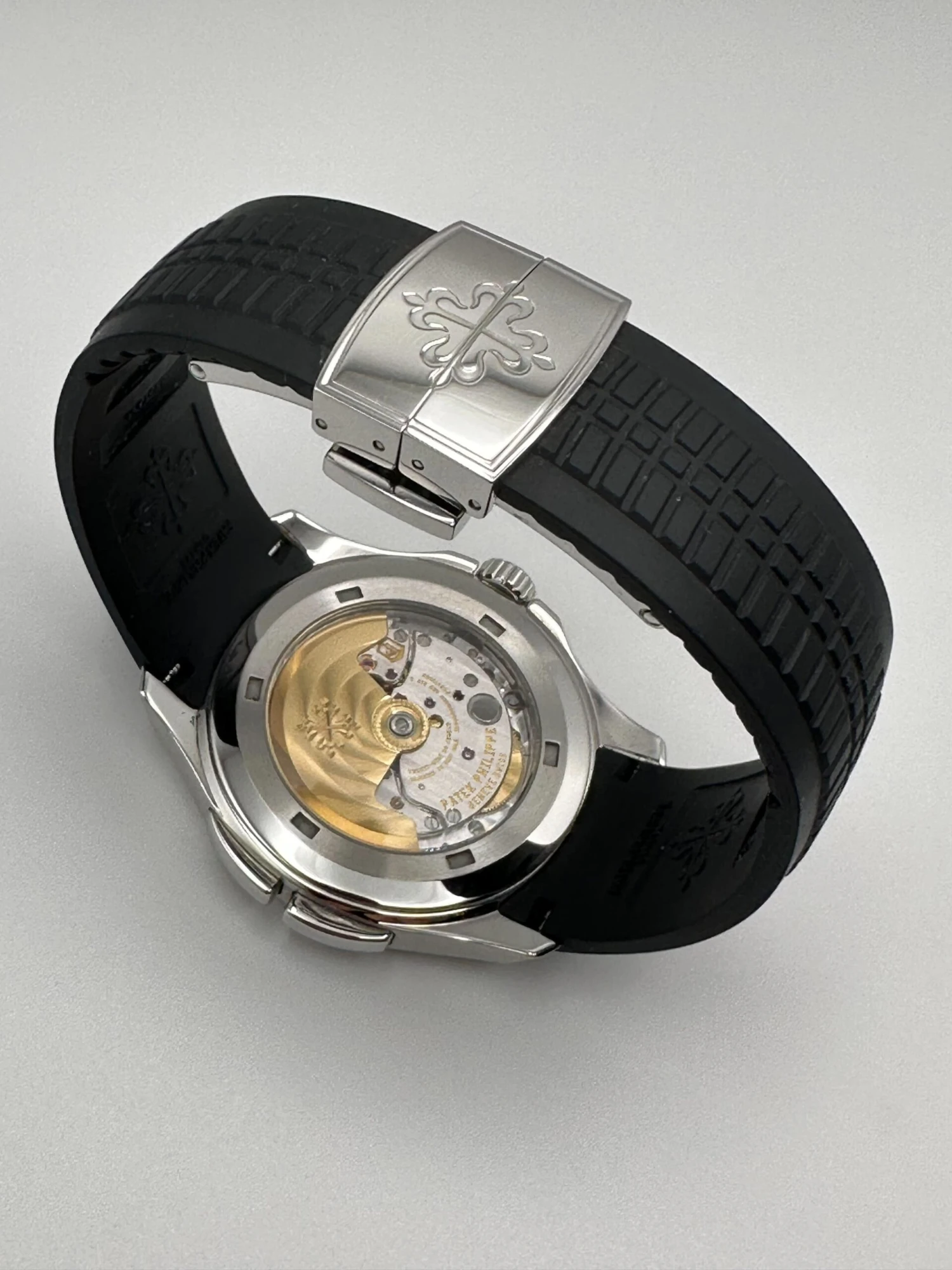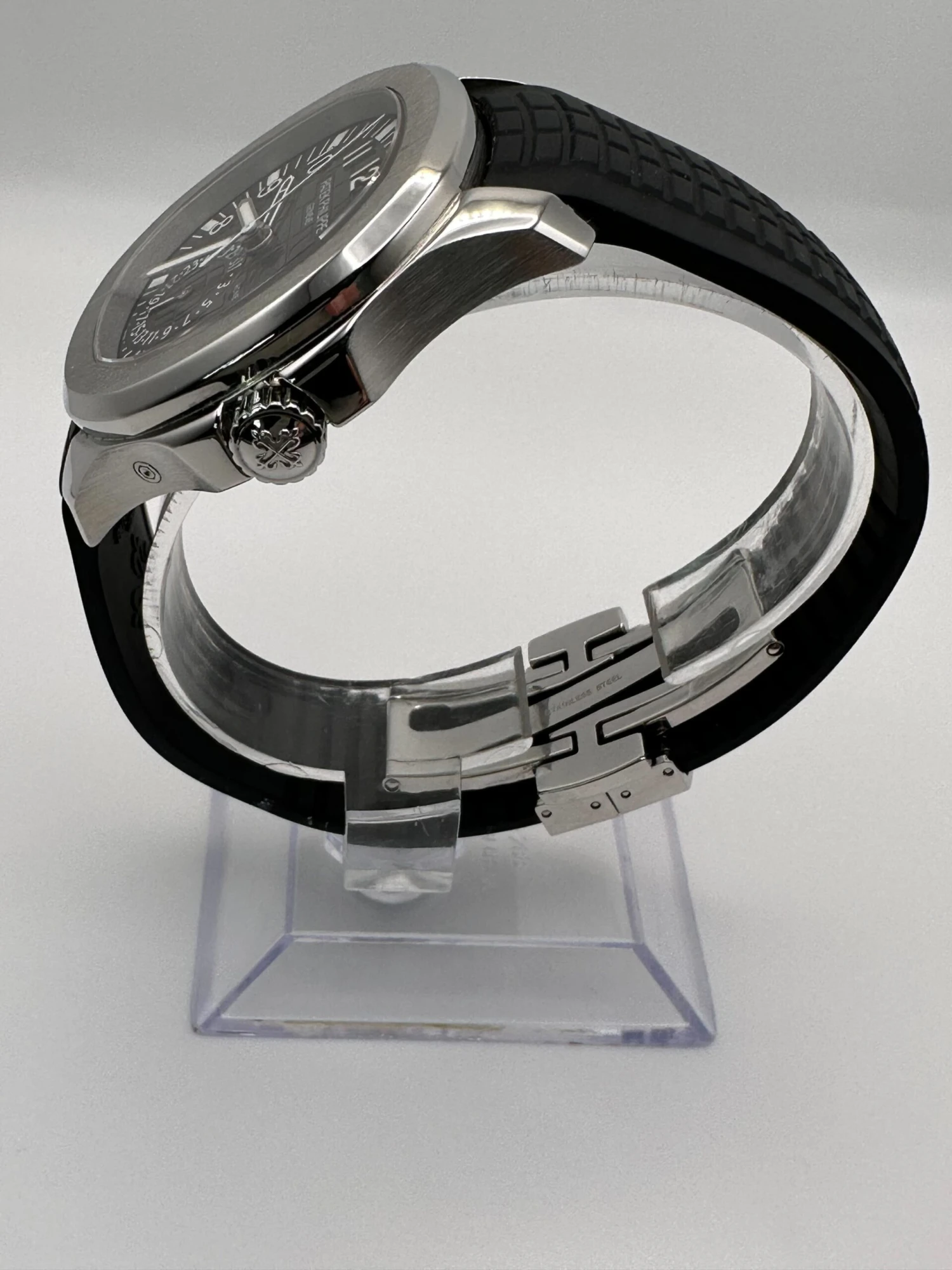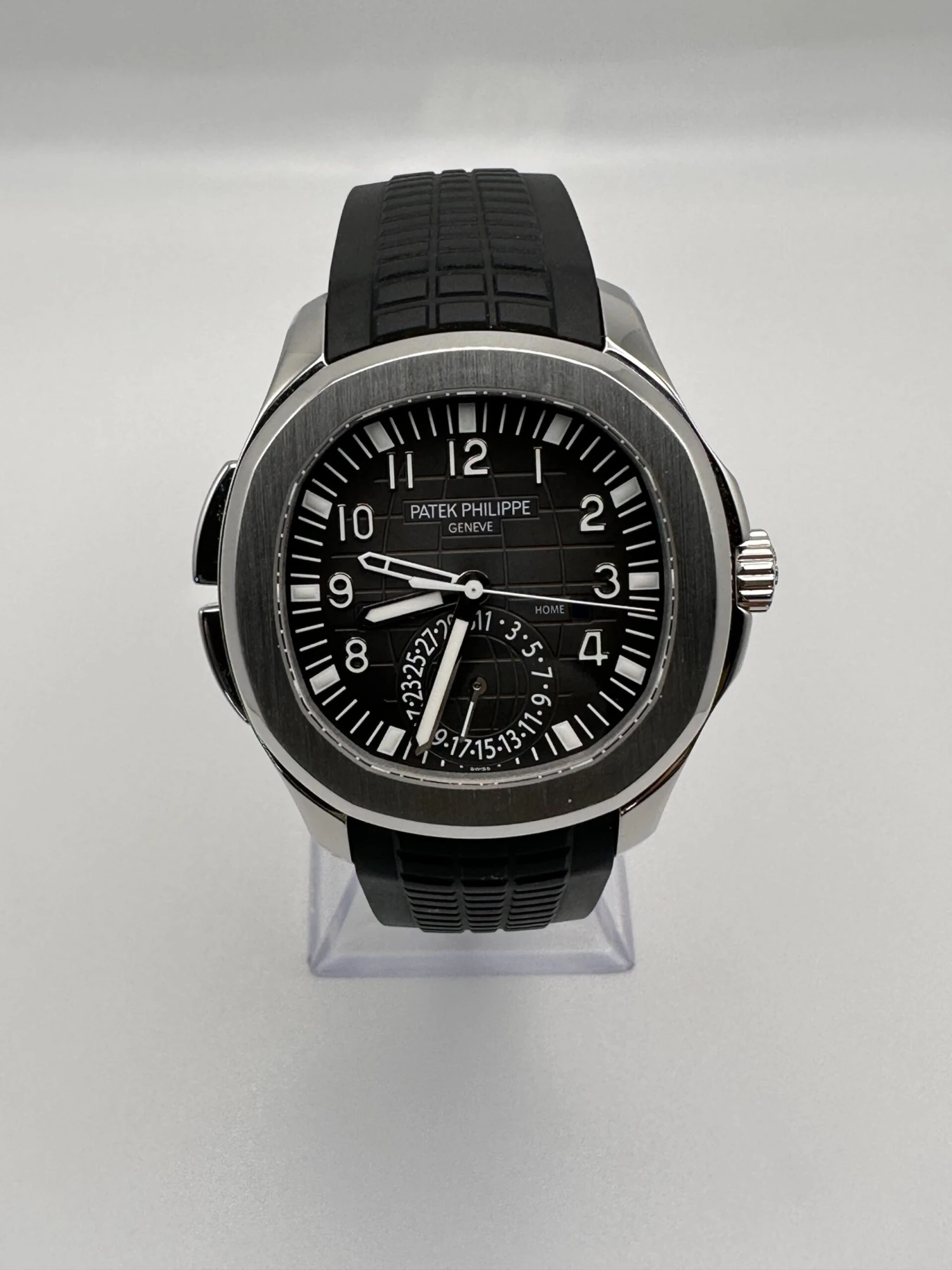 This Patek Philippe Aquanaut ‘Travel Time’ is designed in a 40mm stainless steel case featuring a black embossed dial with luminous white numerals. It is protected by a sapphire-crystal case back and housed on a black rubber bracelet and Aquanaut fold-over clasp. Complications include dual time zones with day/night indicators, making this timepiece the perfect travel companion.