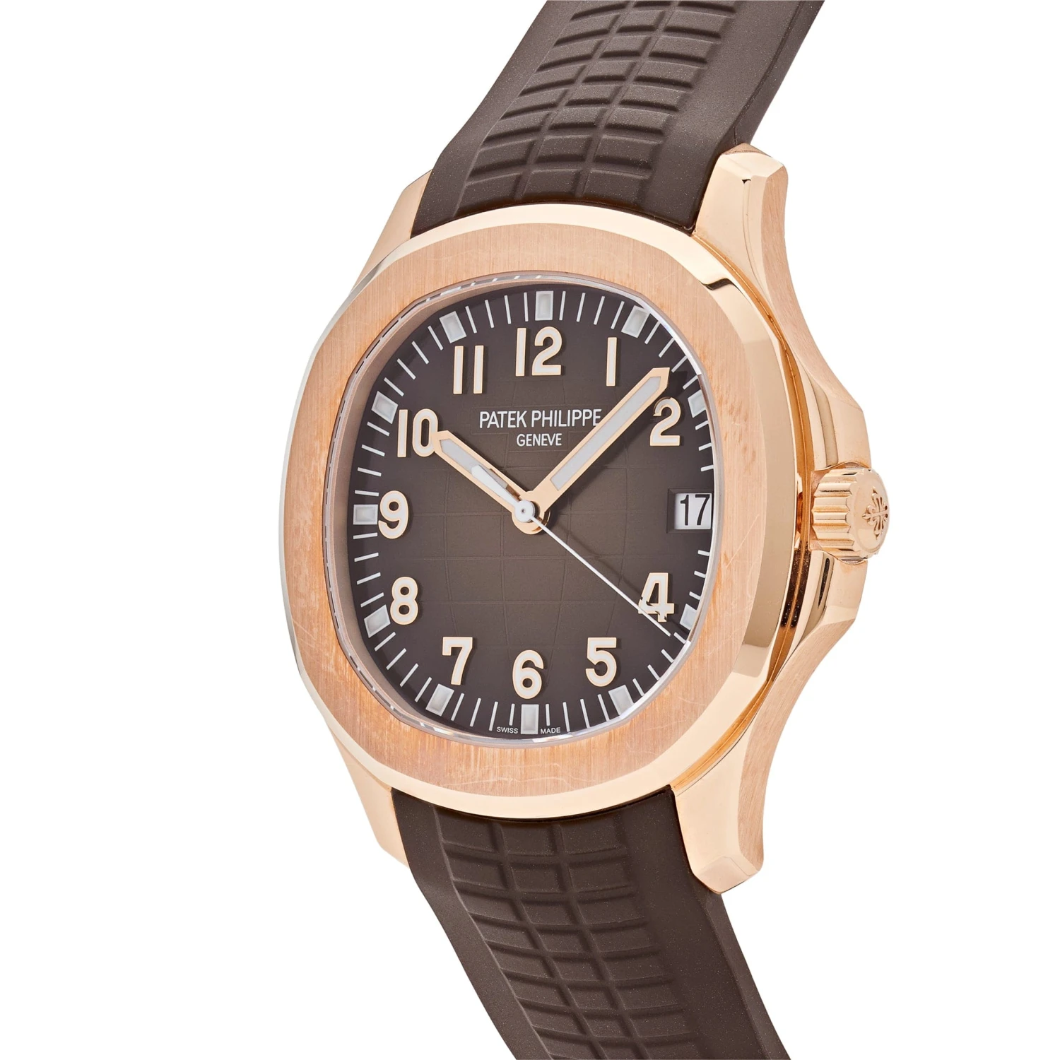 This Patek Philippe Aquanaut is designed in a 40mm 18K Rose Gold case surrounding an embossed chocolate brown dial and styled on a brown composite strap. The sapphire crystal case-back gives a glimpse of the movement, powering the features like the date display window settled at 3 o’clock.