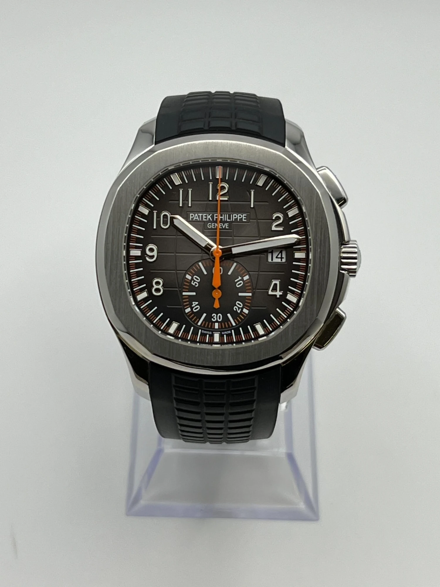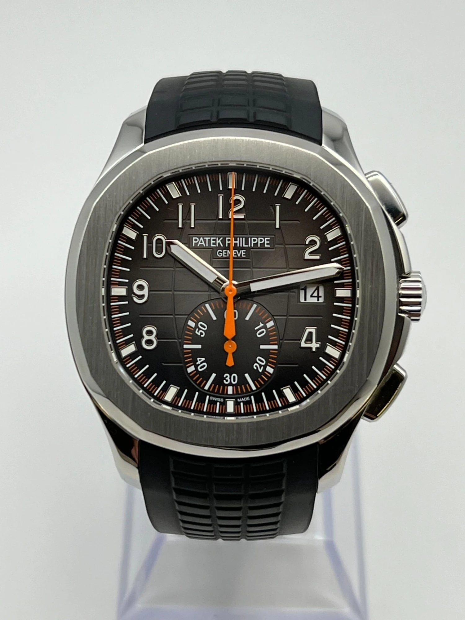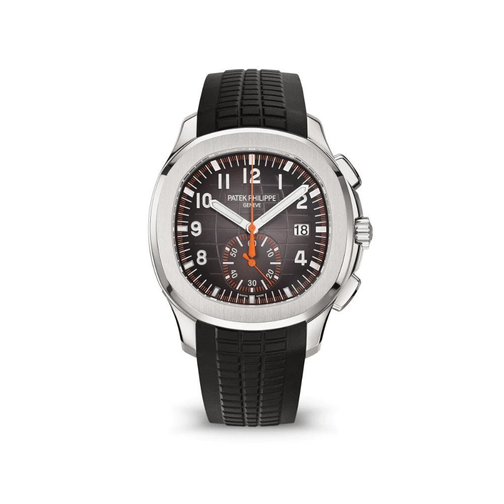This Patek Philippe Aquanaut Chronograph is designed in a 42.2mm stainless steel case. The black embossed dial displays a contrasting orange chronograph and gold applied numerals. It is protected by a sapphire-crystal case back and comes on a black rubber bracelet with an Aquanaut fold-over clasp.