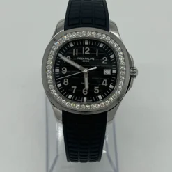This Patek Philippe Aquanaut Luce is crafted in a stainless steel case measuring 30 x 28mm. The black dial is surrounded by a dazzling diamond set bezel. The watch comes on a black rubber bracelet.