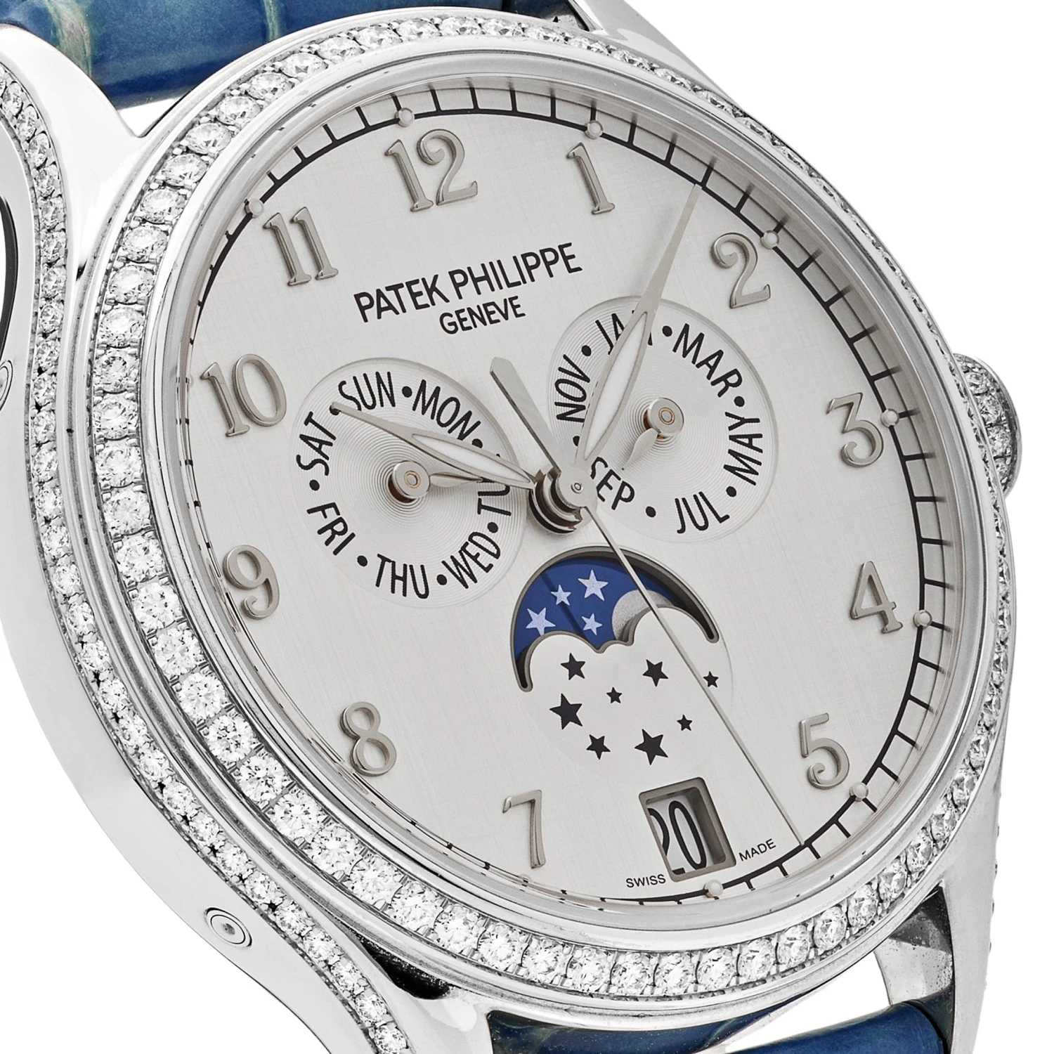 This Patek Philippe Complications Annual Calendar is crafted in a white gold 38mm case, surrounded by an exquisite diamond set bezel. The silky silver dial delivers femininity and function, as it features day, month, and moon phase timekeeping capabilities. The watch comes on a blue alligator leather strap with a pin buckle.