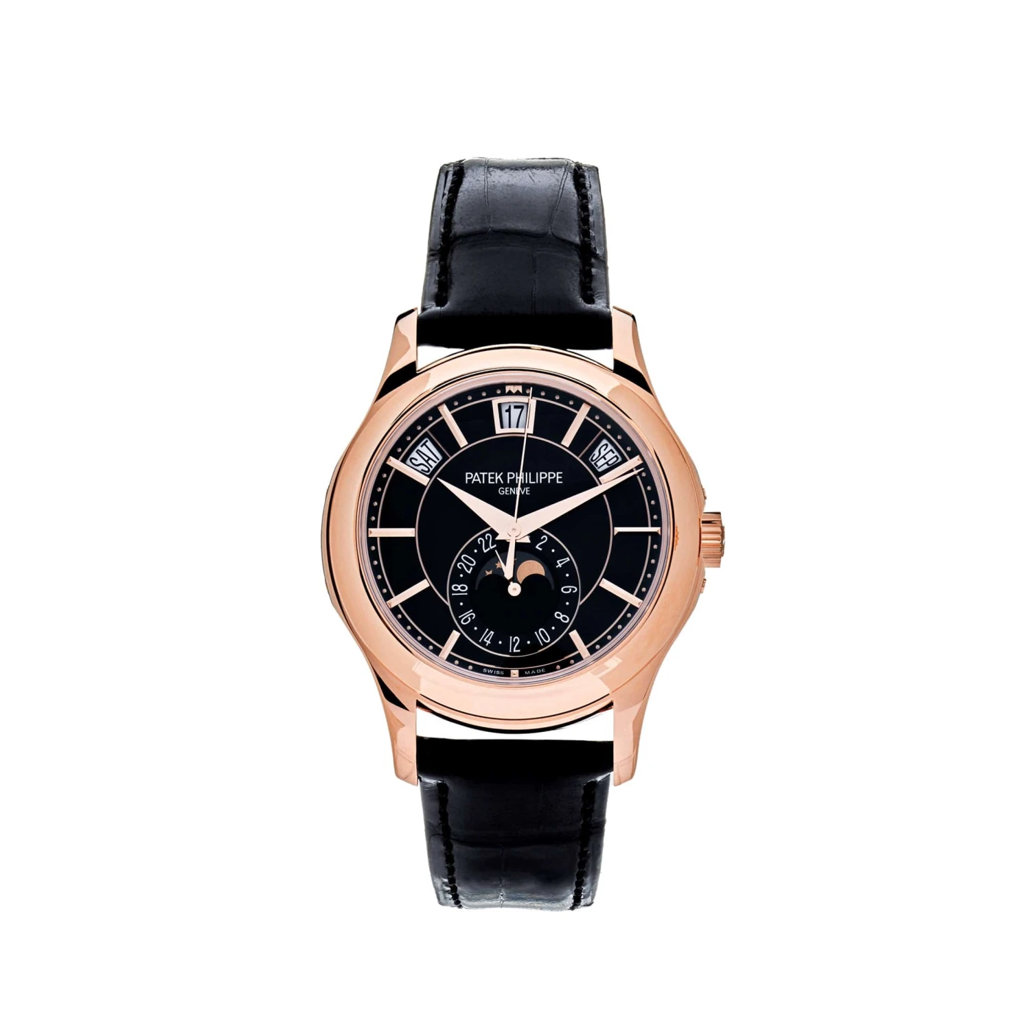 This Patek Phillippe Annual Calendar Complications watch features a stunning 40mm case made of rose gold, an alligator leather strap, black dial and the ingenious patented Patek Philippe Annual calendar mechanism that is sure to impress.