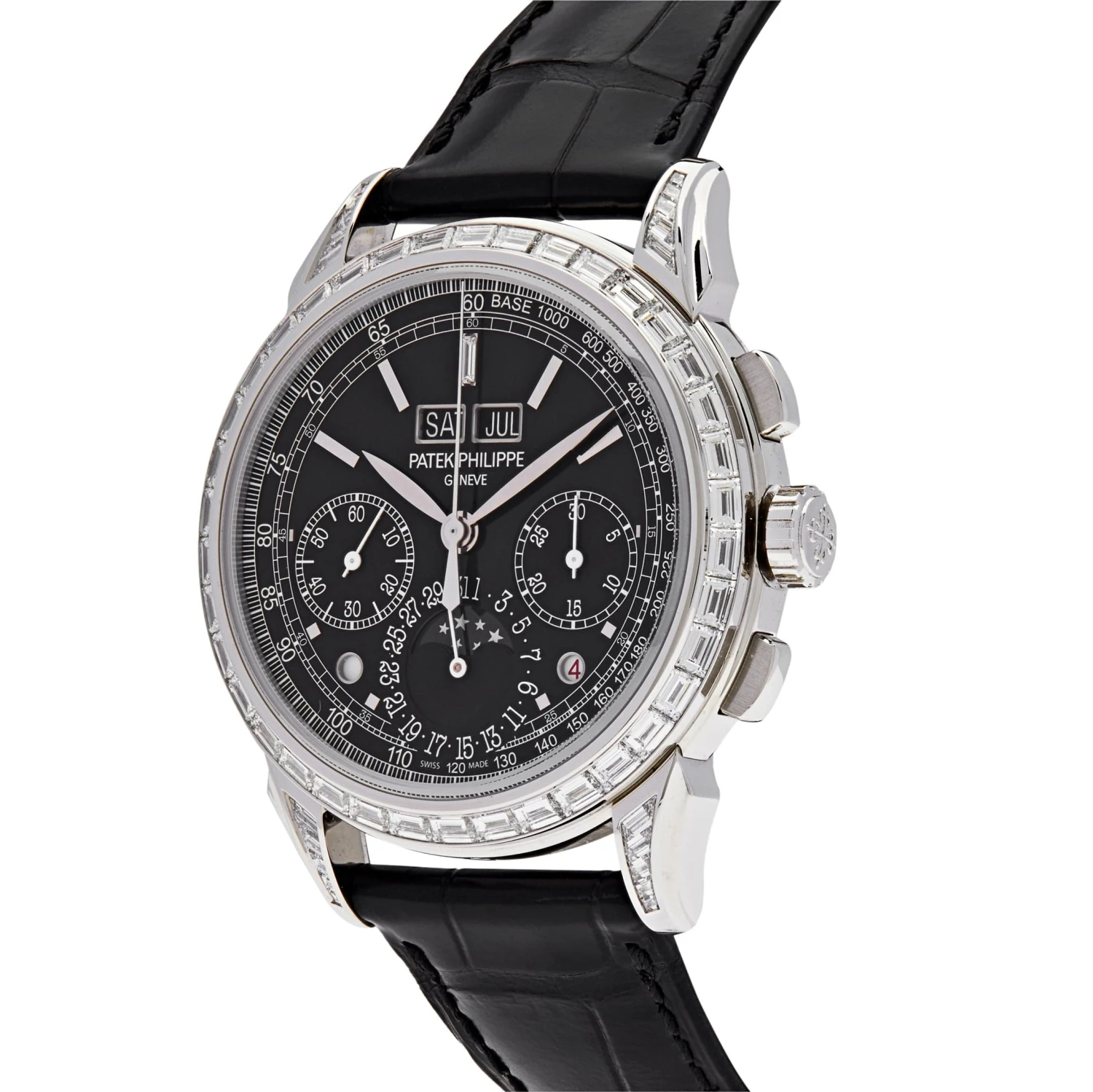 This Perpetual Calendar Grand Complications 5271P-001 features a 41mm platinum case with a baguette diamond set bezel. The black dial features three sub-dials with the day, month, leap year and day/night indication in apertures. The watch comes on a black alligator leather strap with a platinum fold-over clasp set with 22 baguette diamonds.