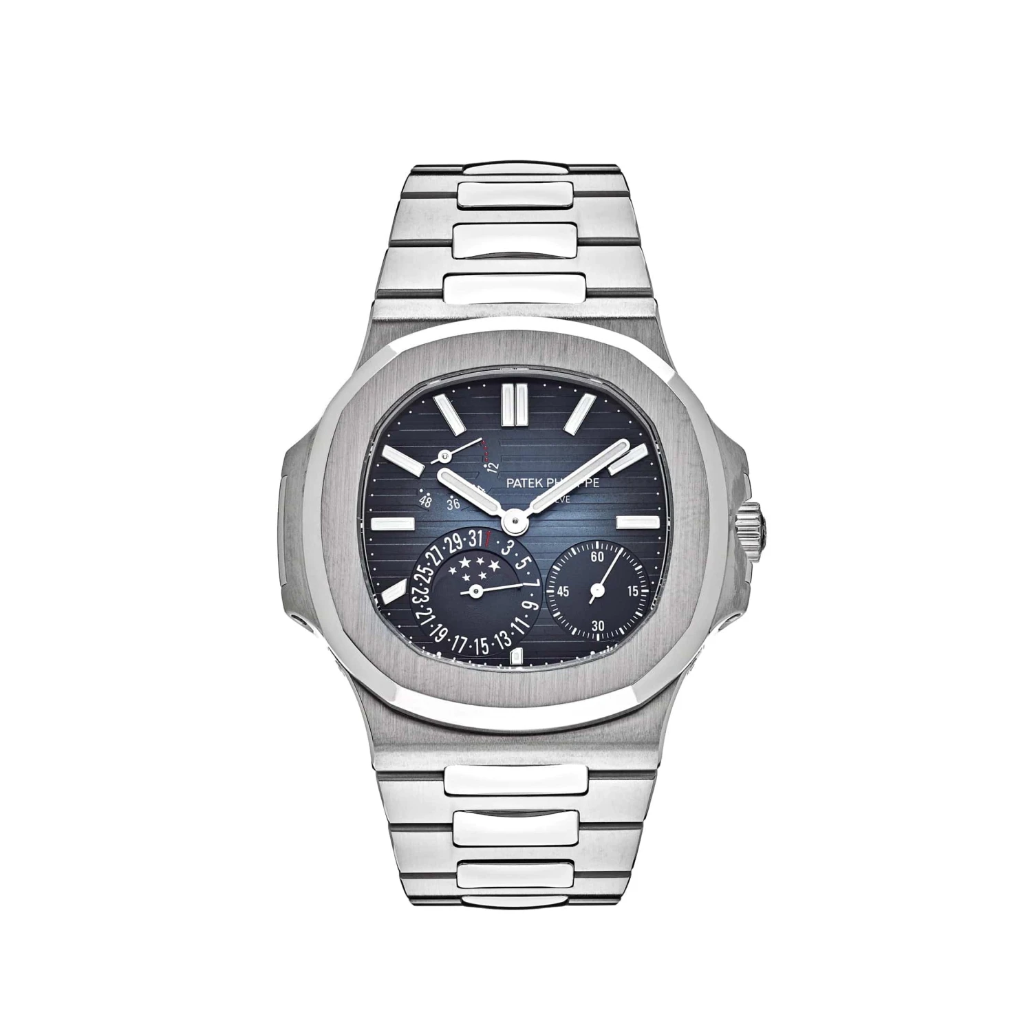 The Patek Philippe Nautilus features a round octagonal bezel and 40.5mm stainless steel case. In the center, lays a blue dial with moon-phase sub-dials, small seconds and a power reserve indicator. This timepiece is fitted on a stainless steel bracelet and fold-over clasp.