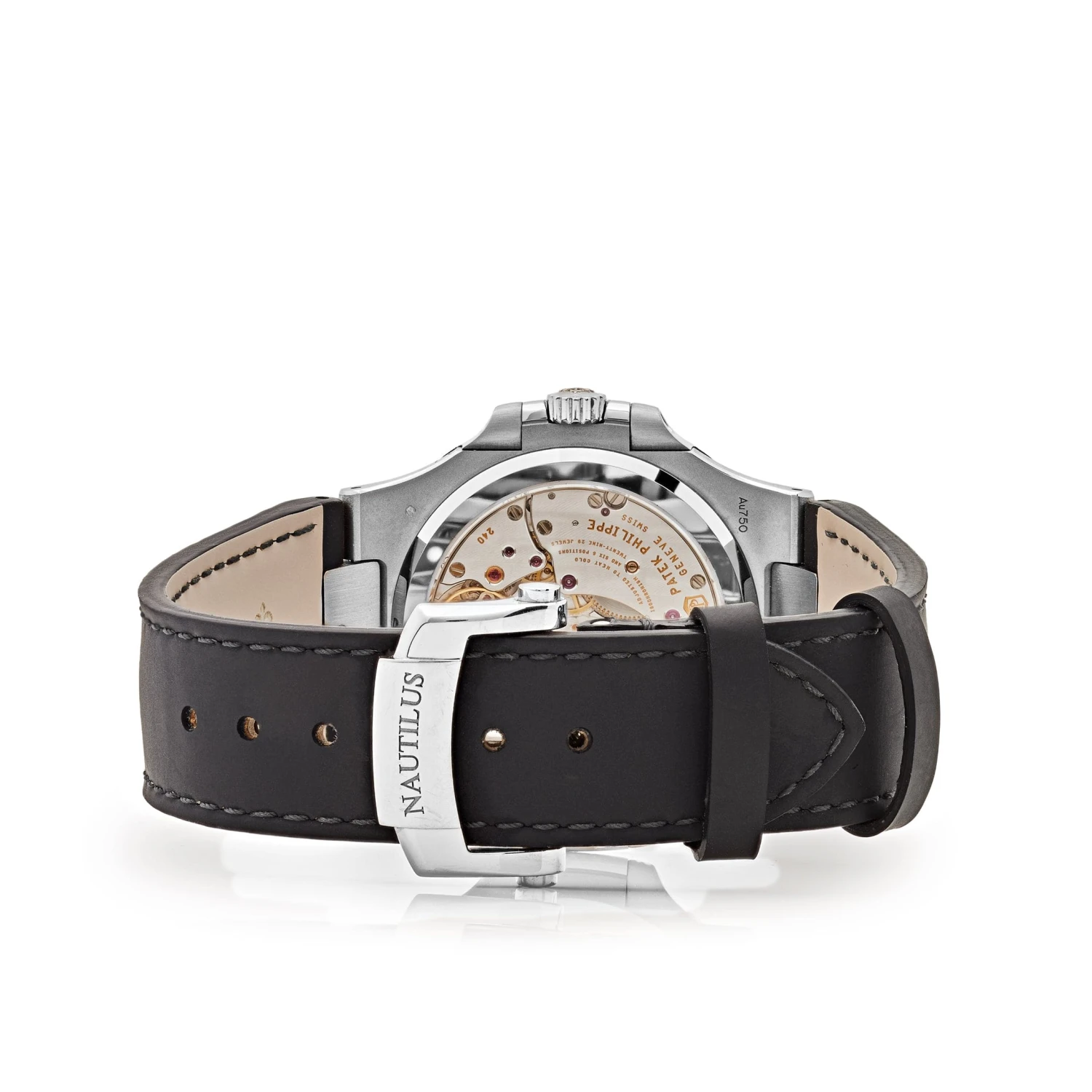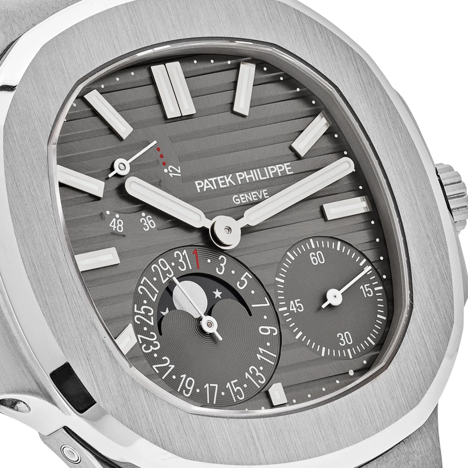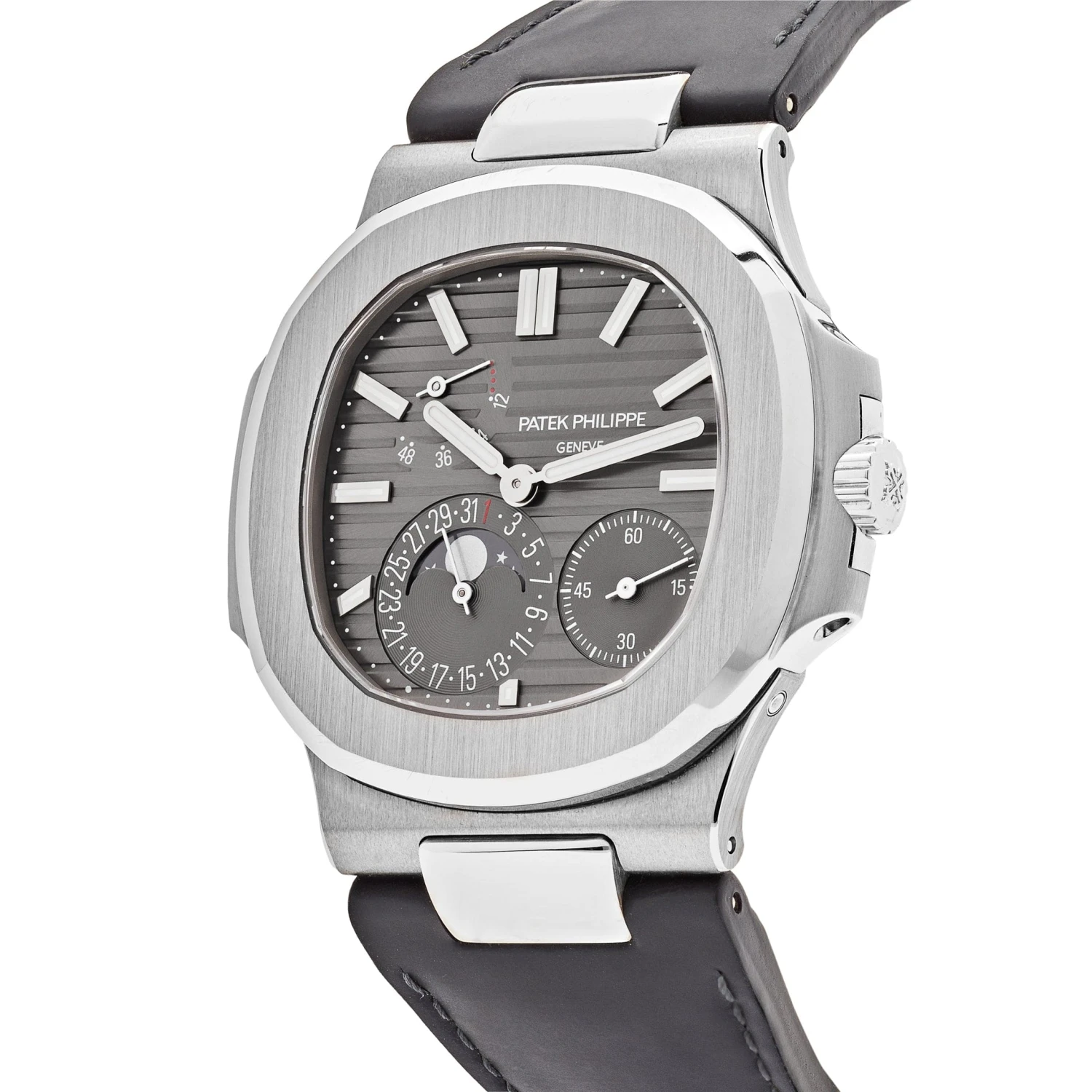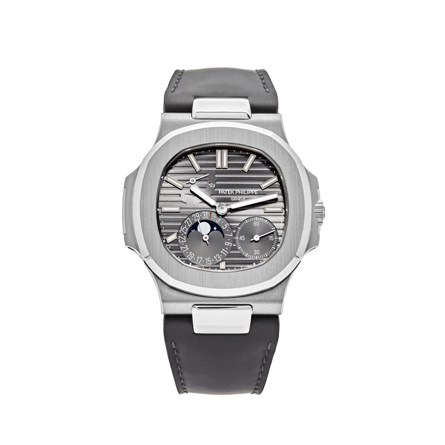 The Patek Philippe Nautilus is designed in a 40mm 18k white gold case, styled on a leather strap. The slate gray dial hosts three sub-dials: a power reserve indicator, seconds hand, and Moon Phase timekeeping capabilities. A subtle and simple sports watch with high-end complications.