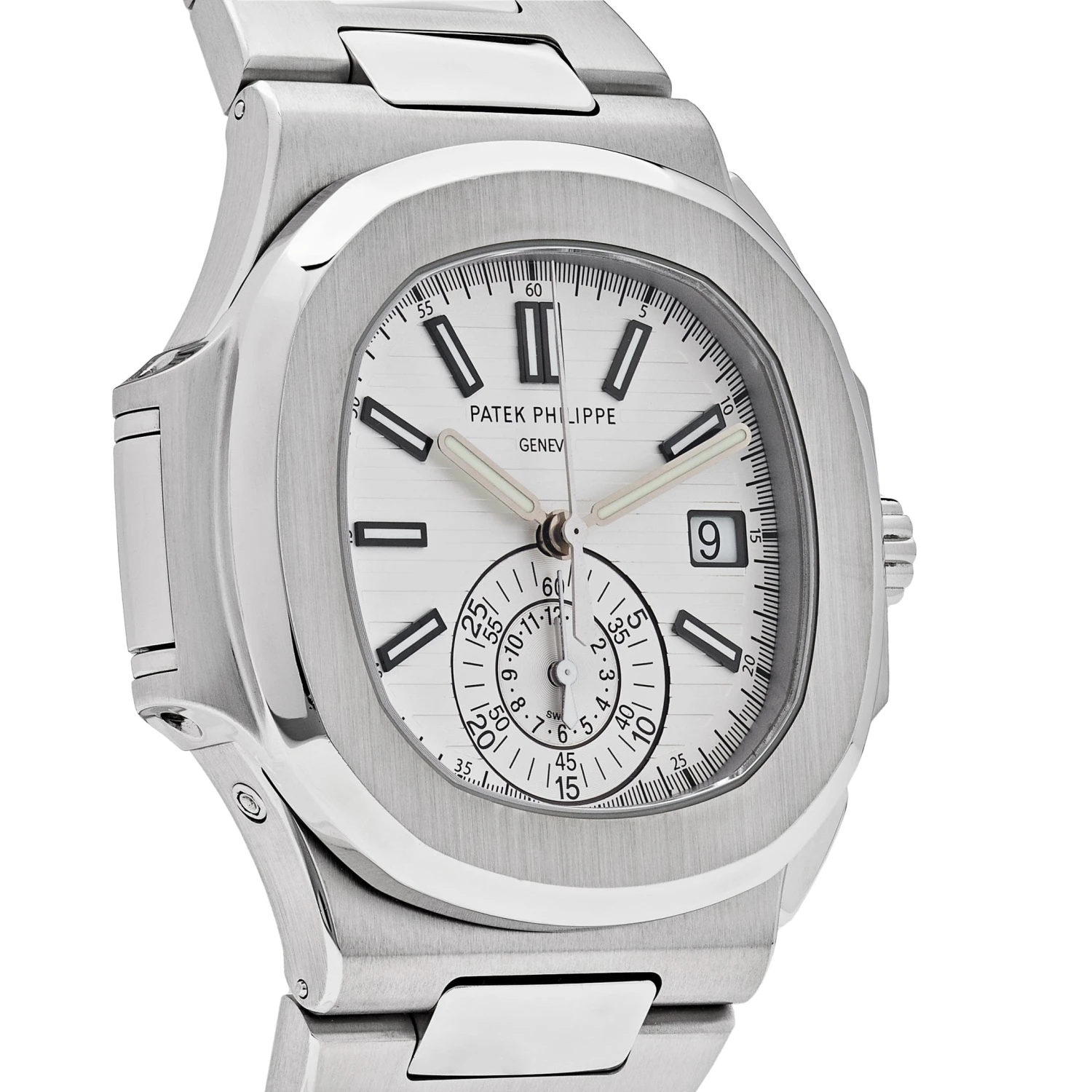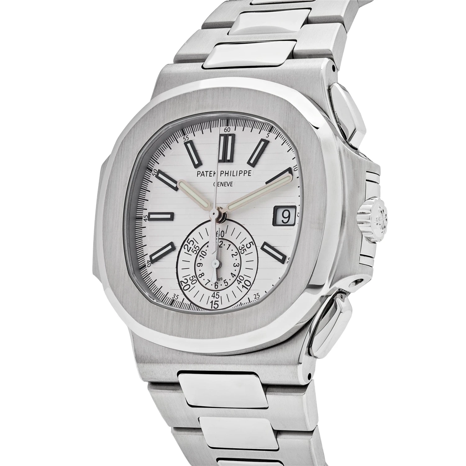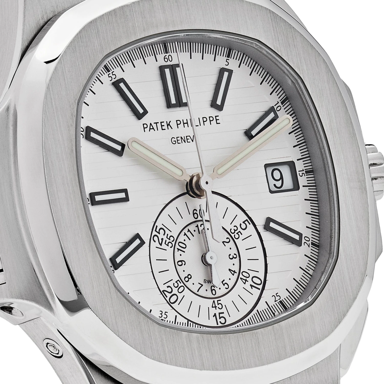 This Patek Philippe Nautilus Chronograph features a 40.5mm stainless steel case with a round octagonal shape and smooth satin-finished bezel. The white dial is protected with a sapphire-crystal and finished with a stainless steel bracelet and fold-over clasp.