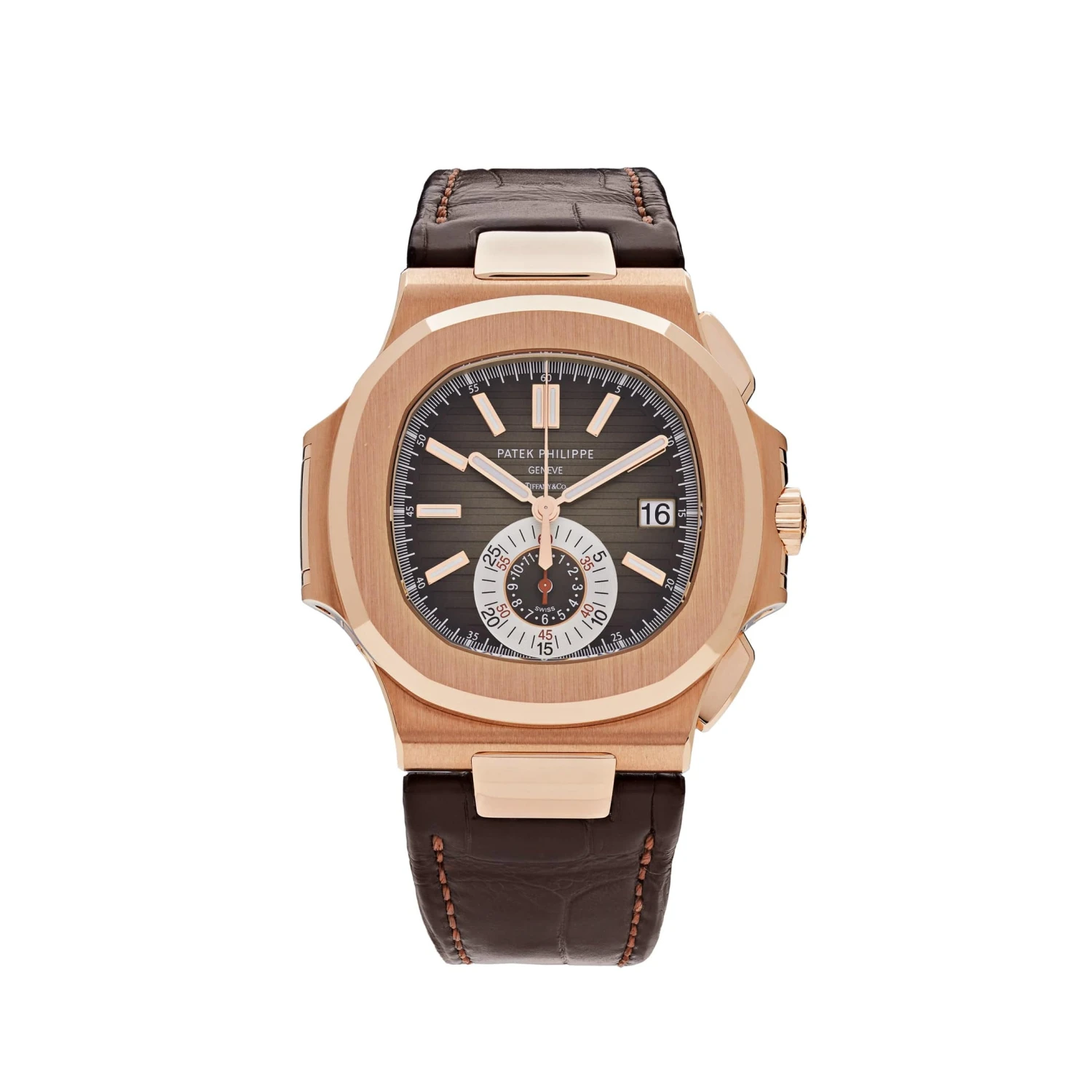 The Patek Philippe Nautilus Chronograph Date is crafted in a 40.5mm rose gold case and styled on a brown leather strap with a folder over clasp. The brown dial hosts chronograph functionality at 6 o’clock and a date window at 3 o’clock. An exhibition case back protected by sapphire crystal provides a unique look into the movement within. This unique piece is a part of the long relationship between Tiffany & Co. and Patek Philippe, with the Tiffany & Co. logo featured in the middle of the dial.