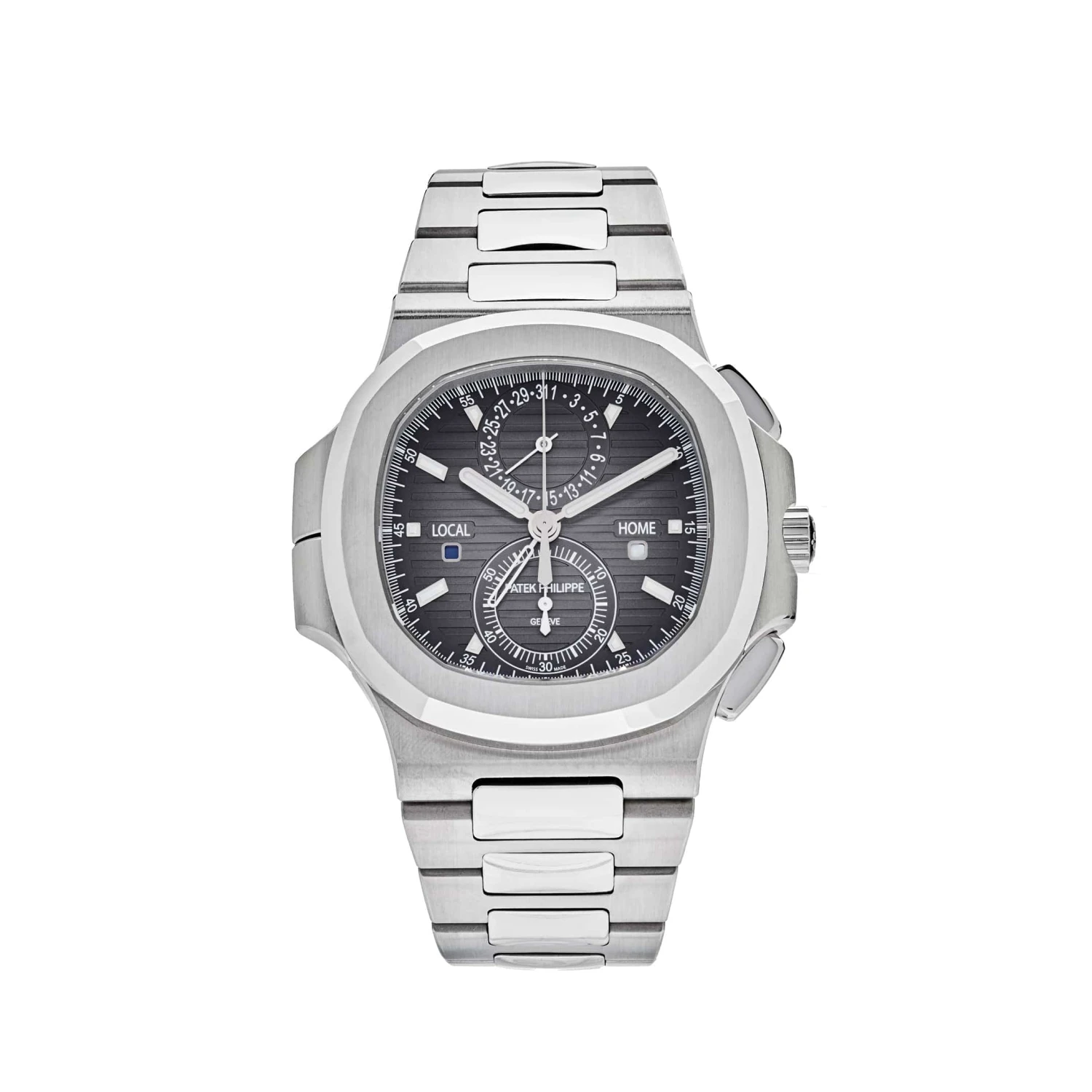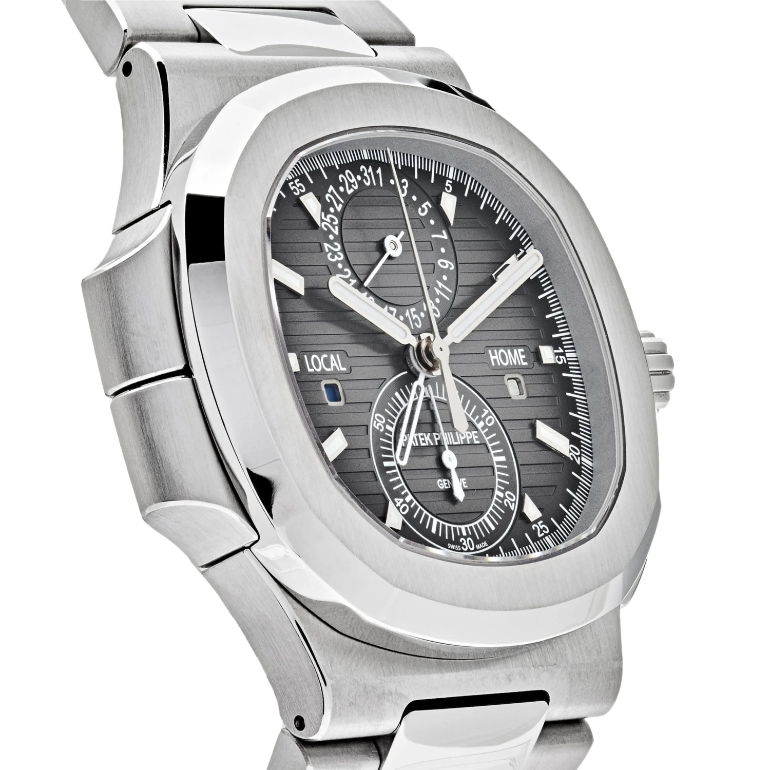 This Patek Philippe Nautilus ‘Travel Time’ Chronograph is crafted in a 40.5mm stainless steel case and styled on a matching steel bracelet. The black embossed dial features white luminescent hour markers. Complications include local and home time zone indication and chronograph functionality.Â