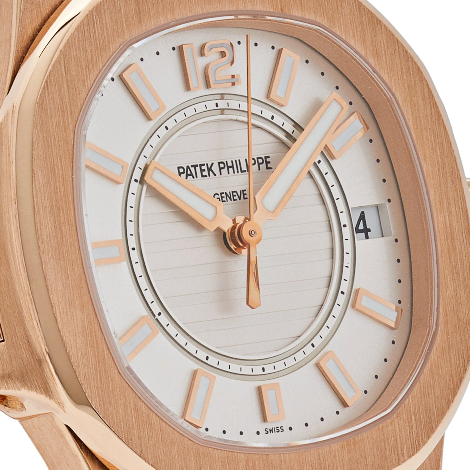 This Patek Philippe Nautilus features a 33mm case crafted in 18-carat rose gold. The smooth rounded rose gold bezel compliments the silver dial. The watch is finished with a rose gold bracelet and folding clasp.