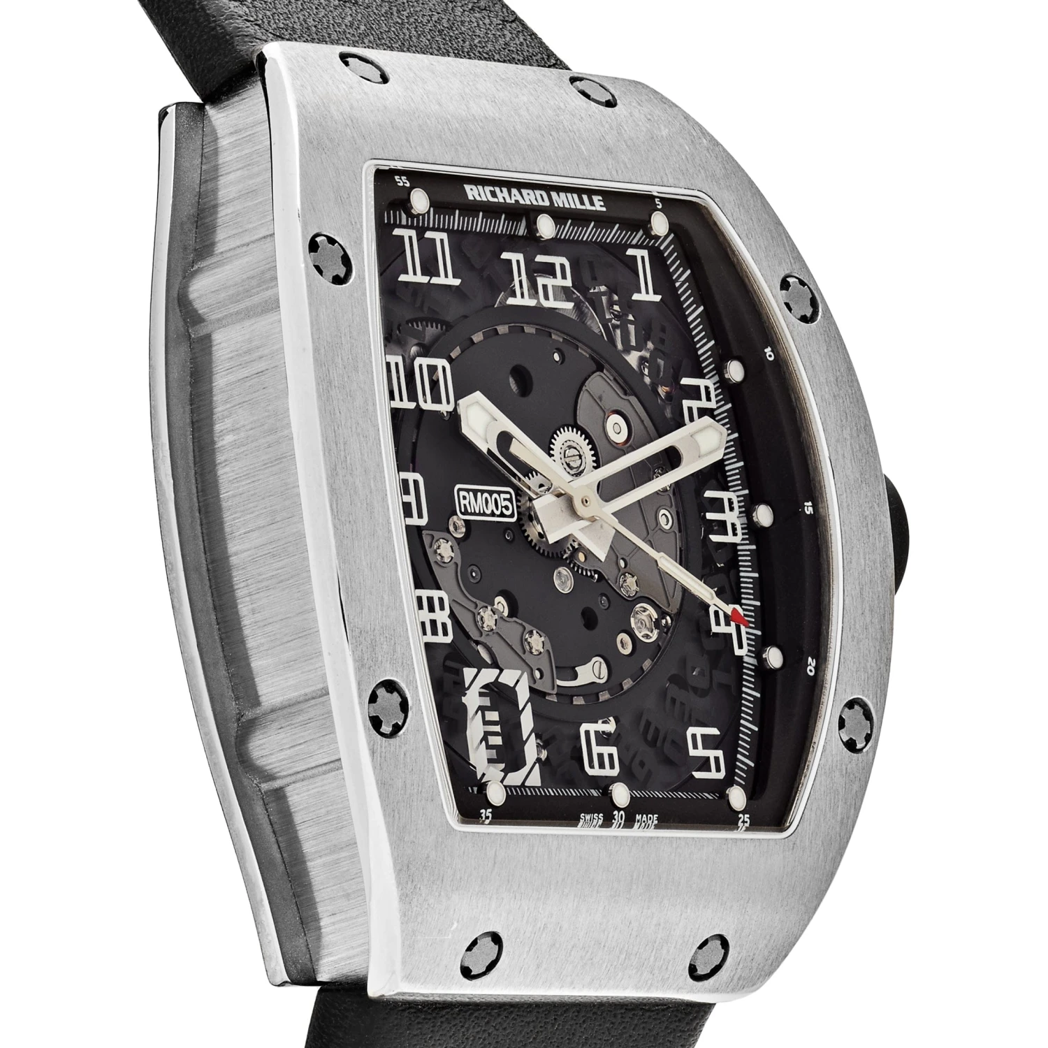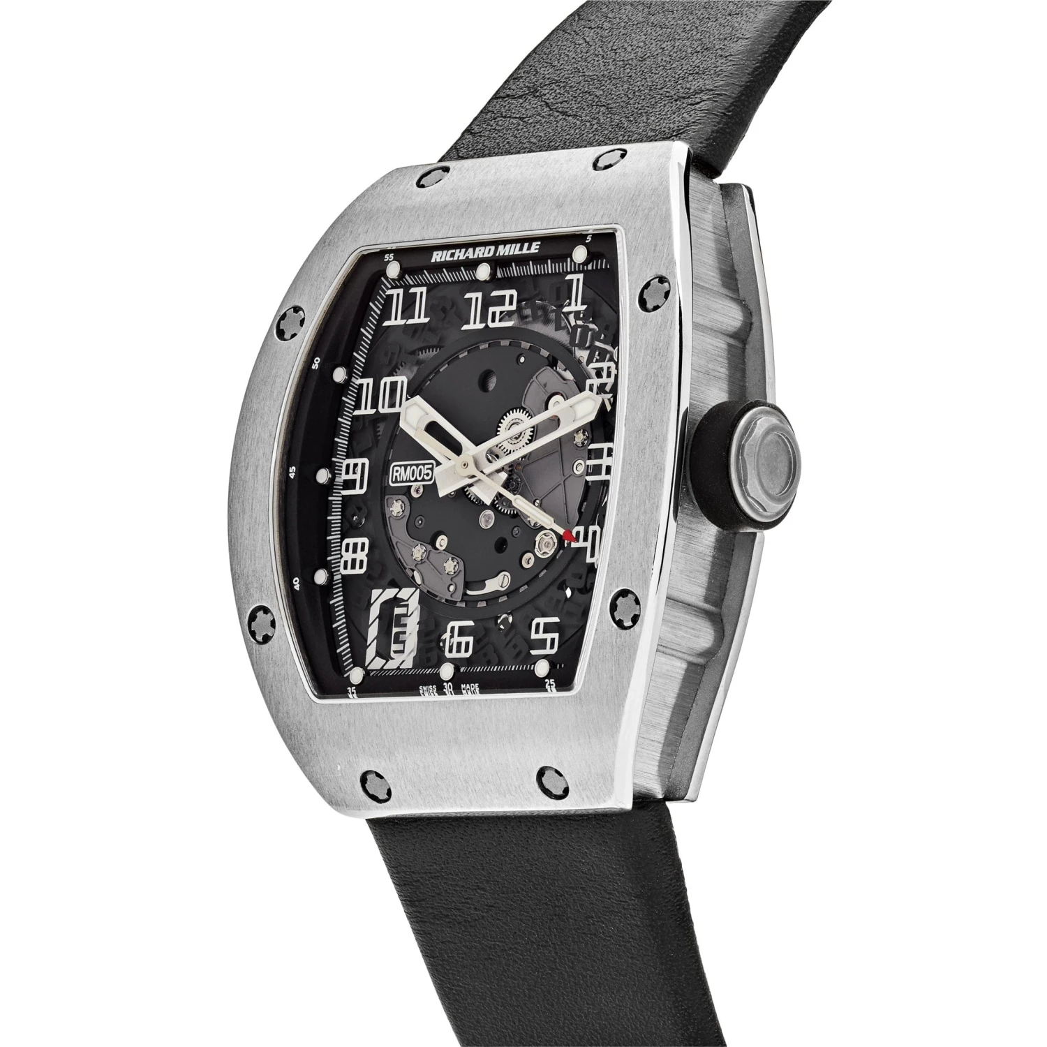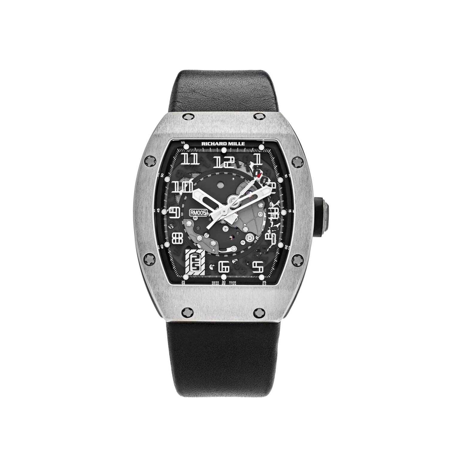First introduced to the world in the early 2000’s, Richard Mille presented the very first RM 005 with a semi-instantaneous date change. The watch features a 38mm white gold case surrounding a skeleton dial on a black leather strap and titanium buckle. The exclusive variable-geometry rotor allows the movement’s winding mechanism to be optimized to the owner’s lifestyle ensuring precision timekeeping in any condition.