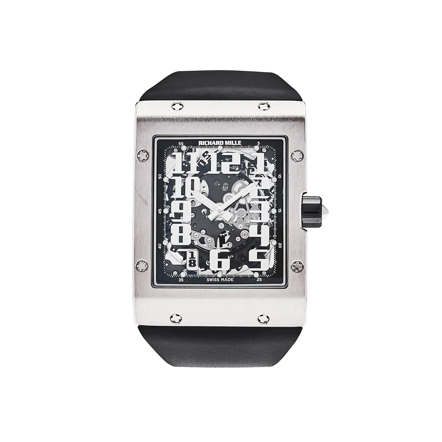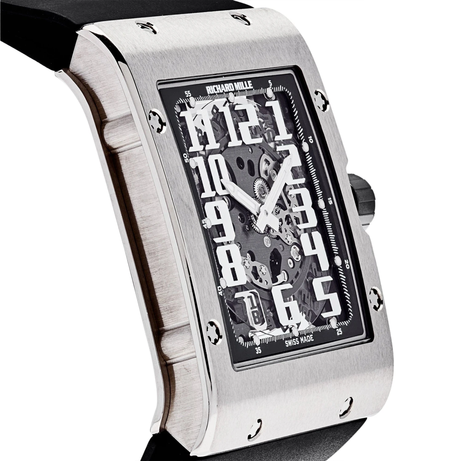 This Richard Mille RM 016 is crafted in an ultra thin 50mm white gold case surrounding a transparent dial with white Arabic numerals. The watch comes on a black rubber strap.