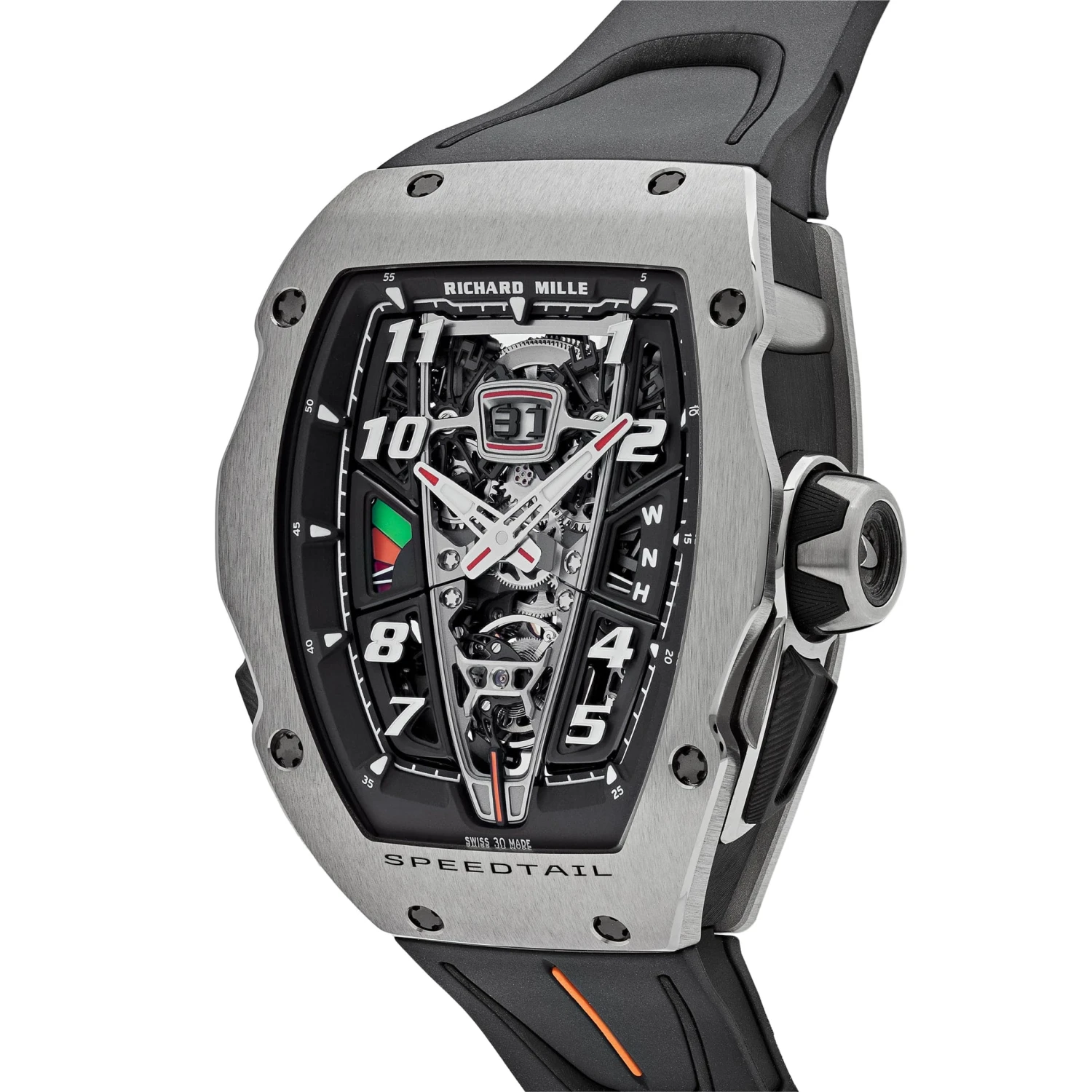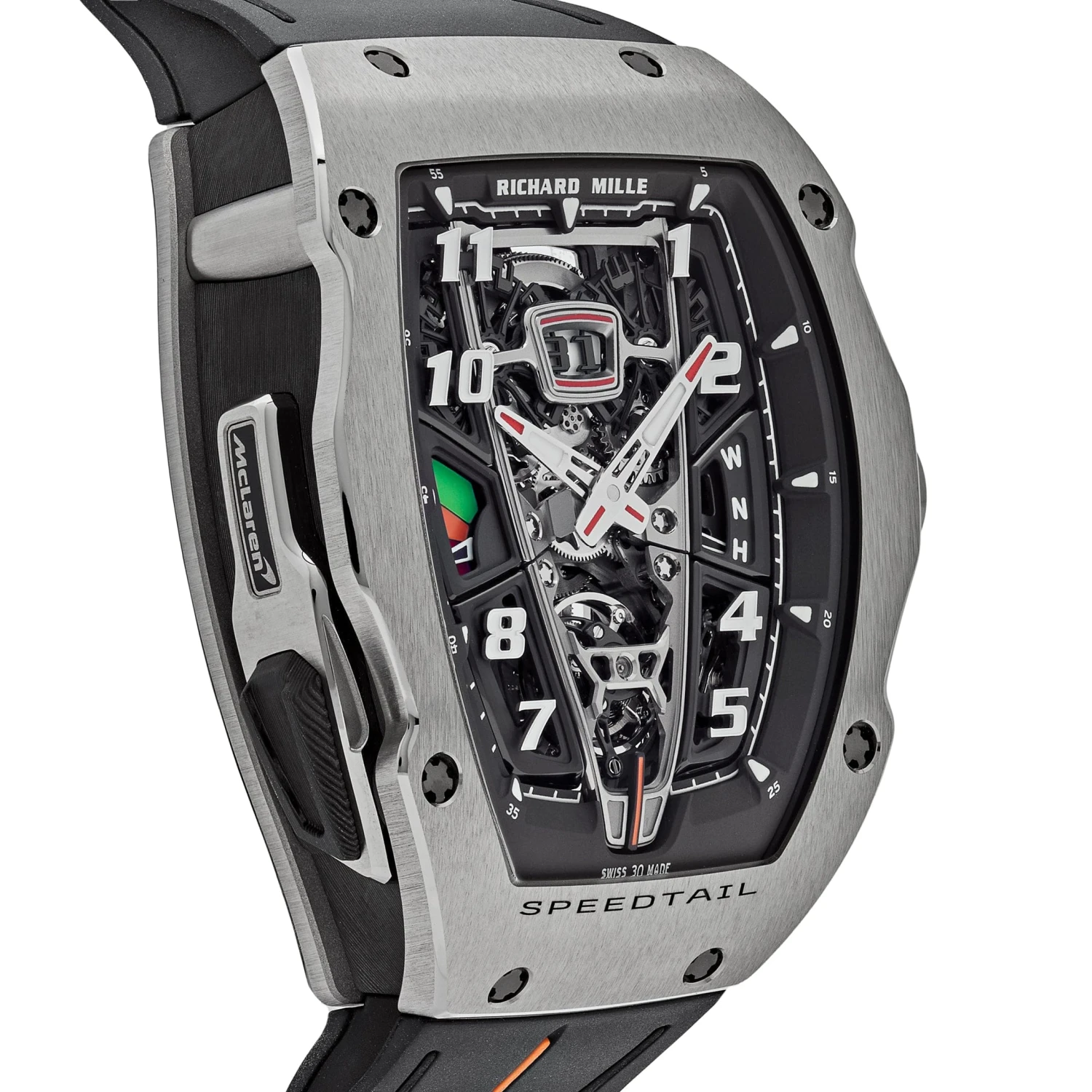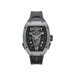 An extreme watch for the fastest car in the world: The Richard Mille RM 40-01 McLaren ‘Speedtail’ Tourbillon. This race car on the wrist is designed in a 48.25mm x 41.80mm titanium case and styled on a black rubber strap. The epitome of high-end craftsmanship and perfect precision is a watch developed by the masterminds of McLaren and Richard Mille.