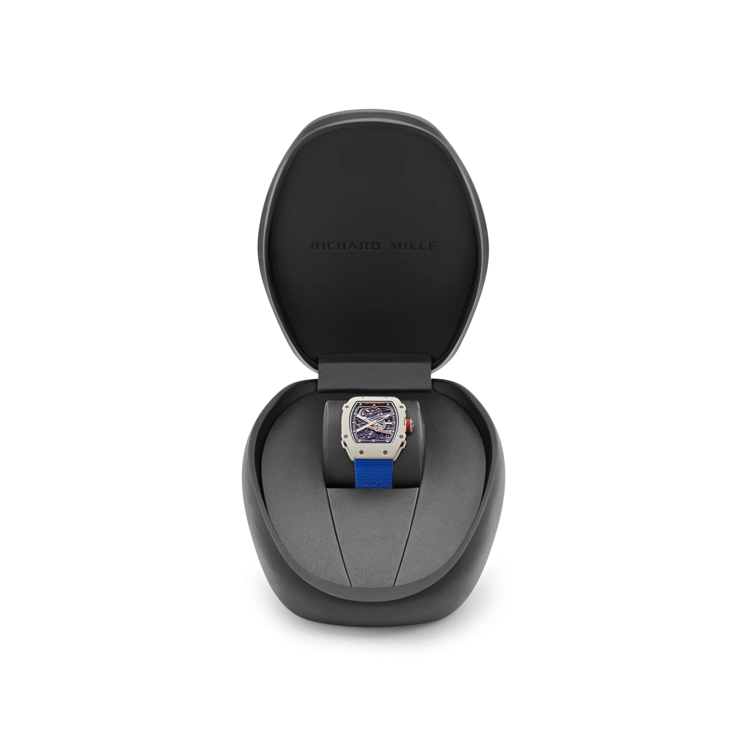 The Richard Mille RM 67-02 has a striking and elegant design thanks to its 38.7mm case made of Quartz TPT and Carbon TPT. The extra-flat skeletal, satin-finish Black-DLC coated dial is hand-painted with the colors of the French flag, representing Alexis Pinturault’s home. A blue textile comfort strap adds a sporty style to this sophisticated timepiece.