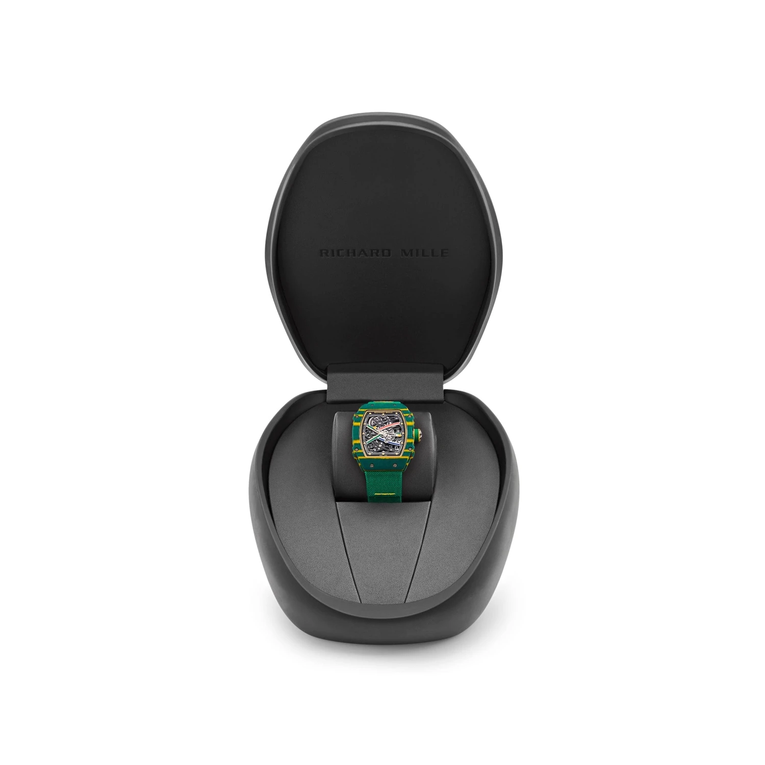 Richard Mille presents an innovative collection inspired by Van Nierkerk – the South African track and field Olympic record holder. The RM 67-02 is designed in a 38mm case crafted from Carbon TPT. The bezel is hand-painted with the bold colors of the South African Flag and fitted on a nylon green strap.