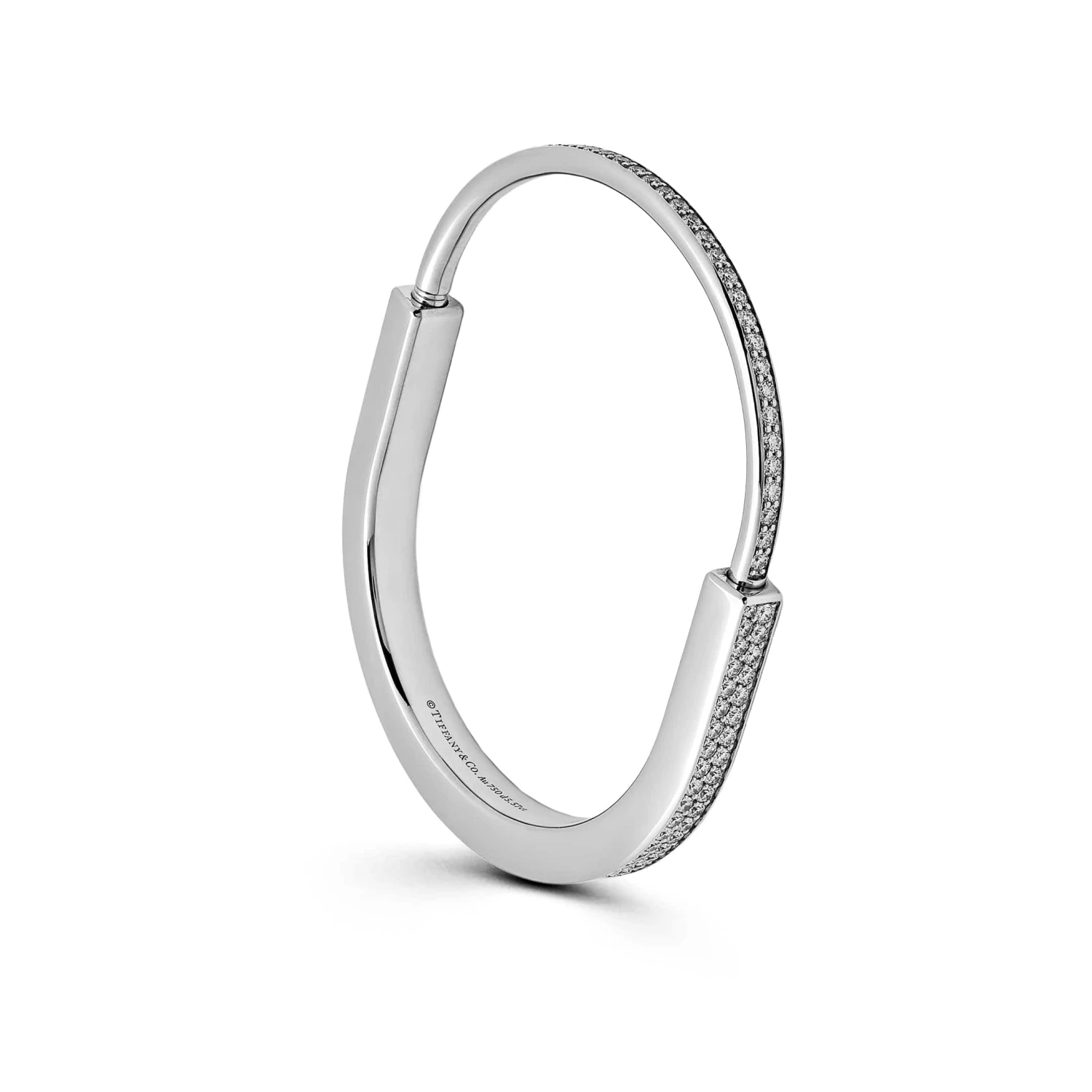 The Tiffany & Co Lock Bangle is for everyone, no matter the gender. It rocks a unique padlock-inspired clasp, a nod to Tiffany’s history. Made with care in 18k white gold and adorned with hand-set round brilliant diamonds totaling 5.92 carats, it offers a stunning contrast. The XX-Large size is perfect for wrists up to 7.75 inches, ensuring a comfortable fit for all. The Tiffany & Co Lock Bangle combines symbolism, craftsmanship, and a touch of elegance, making it a profound and stylish accessory for diverse individuals.