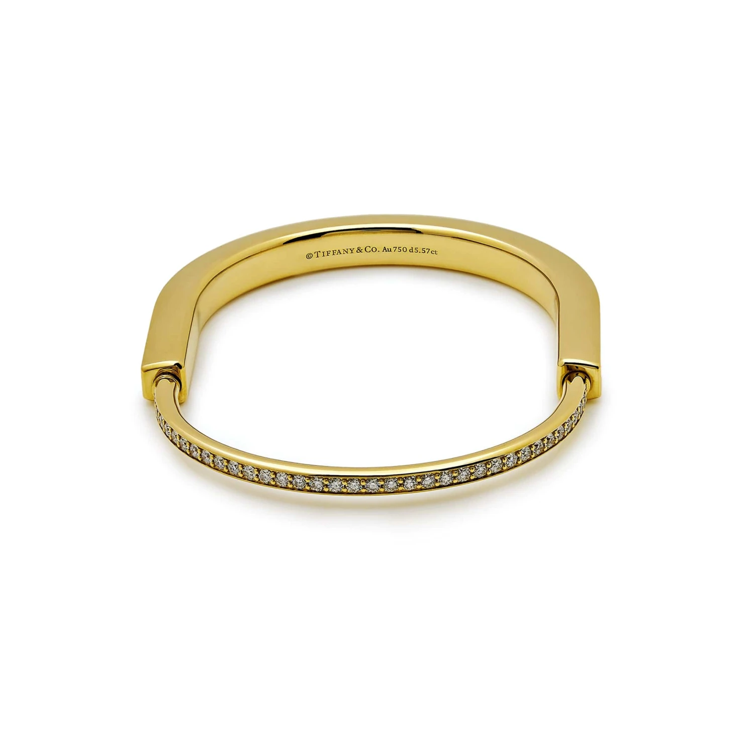 The Tiffany & Co Lock Bangle is for everyone, no matter the gender. It rocks a unique padlock-inspired clasp, a nod to Tiffany’s history. Made with care in 18k yellow gold and adorned with hand-set round brilliant diamonds totaling 5.57 carats, it offers a stunning contrast. The extra-large size is perfect for wrists up to 7.25 inches, ensuring a comfortable fit for all. The Tiffany & Co Lock Bangle combines symbolism, craftsmanship, and a touch of elegance, making it a profound and stylish accessory for diverse individuals.
